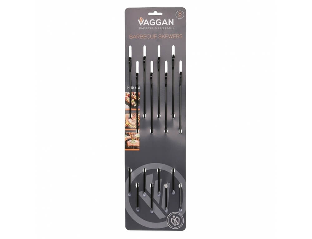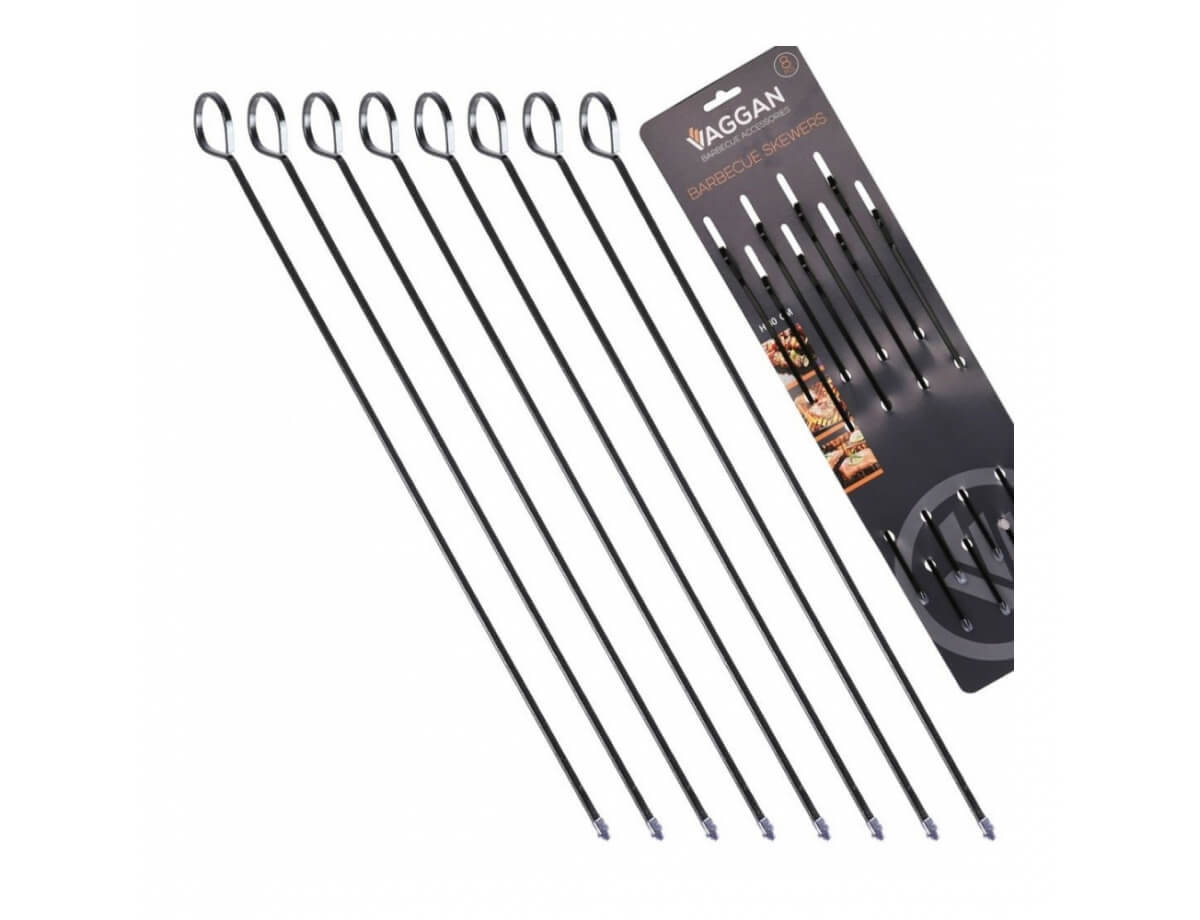 Τα οκτώ μεταλλικά σουβλάκια μπάρμπεκιου της εταιρείας Vaggan είναι κατασκευασμένα από ανοξείδωτο ατσάλι και διαθέτουν αντικολλητική επίστρωση, για να διευκολύνουν το ψήσιμο των τροφίμων. Με μήκος 40 εκατοστά, αυτά τα σουβλάκια θα σας βοηθήσουν να ετοιμάσετε νόστιμα και τέλεια ψημένα κομμάτια κρέατος για το μπάρμπεκιου σας. Απολαύστε την υψηλή ποιότητα και αντοχή τους και απολαύστε υπέροχες γεύσεις κάθε φορά που ψήνετε στο μπάρμπεκιου!