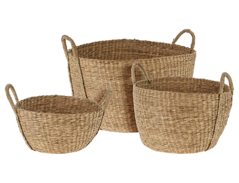 Το σετ διακοσμητικών καλαθιών σε στρογγυλό σχήμα αποτελείται από 3 τεμάχια διαφορετικού μεγέθους. Τα καλάθια είναι κατασκευασμένα από ψάθα, που προσφέρει μια πιο εναρμονισμένη με τη φύση αισθητική. Για τη φροντίδα τους, λόγω των ινών της ψάθας χρησιμοποιήστε ήπια καθαριστικά. Ιδανικό για να τοποθετήσετε στο εσωτερικό του ενα φυτό εσωτερικού χώρου δίνοντας μια boho νότα στο χώρο σας. Διαθέτουν χερούλια για να μπορείτε να τα μετακινείτε. Μπορούν να λειτουργήσουν σαν διακοσμητικά στοιχεία σε οποιαδήποτε γωνία του σπιτιού σας αλλα και σαν αποθηκευτικός χώρος.