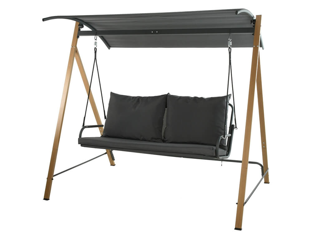 Απολαύστε στιγμές χαλάρωσης με τα αγαπημένα σας πρόσωπα στον κήπο ή τη βεράντα σας με την κούνια κήπου. Έχει σχεδιαστεί για να φιλοξενεί μέχρι 2 άτομα και έχει αντοχή μέχρι 220 κιλά. Ο σκελετός της είναι κατασκευασμένος από ατσάλι, διαθέτει μαξιλάρια στο κάθισμα σε ανθρακί χρώμα και στέγαστρο, για να σας καλύπτει και να σας δροσίζει με τη σκιά του, τις ζεστές και ηλιόλουστες ημέρες. Για να παρατείνετε τη διάρκεια ζωής της κούνιας προτείνεται να την καλύπτετε τον χειμώνα ή σε περίπτωση ακραίων καιρικών φαινομένων.