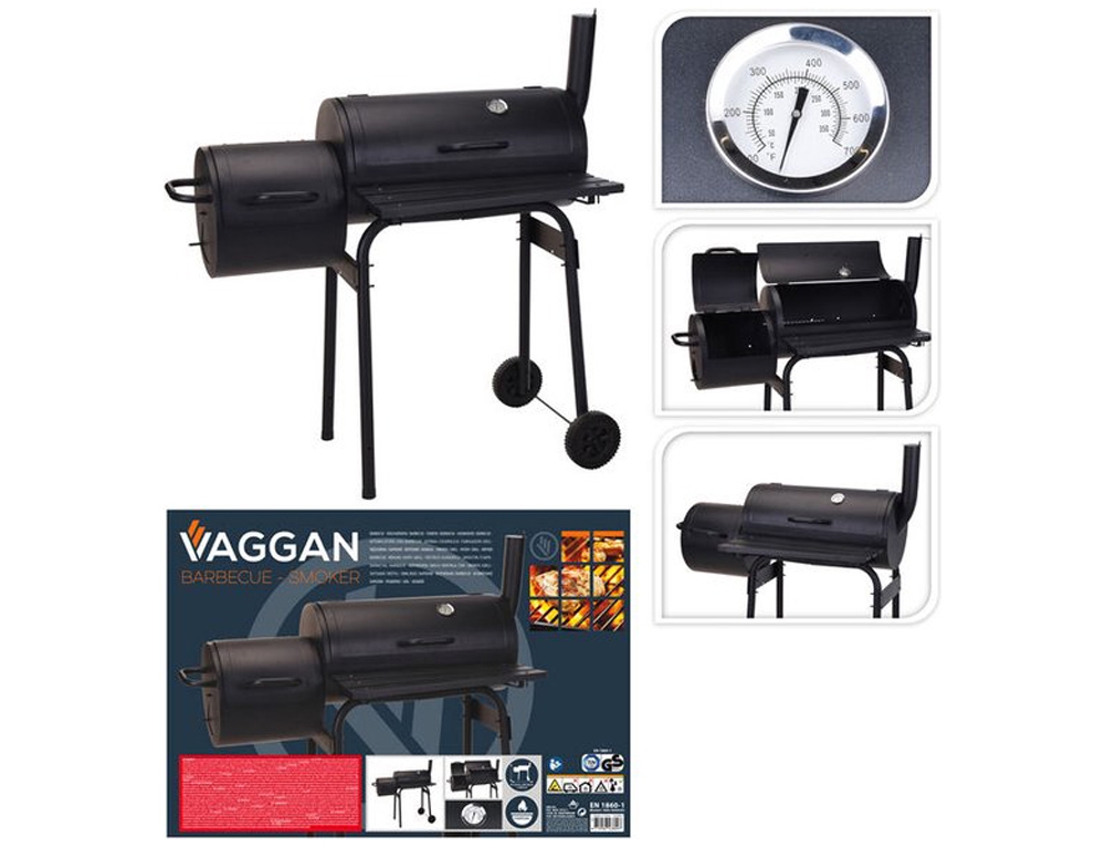 Ψησταριά & καπνιστής BBQ κάρβουνου, ξύλου Vaggan (X86000020) Με Καπάκι, Καμινάδα και θερμόμετρο, Λαβές και πόδια στήριξης με 2 τροχούς, Πάγκο, Μεταλλική, 30 x 61 x 95 cm