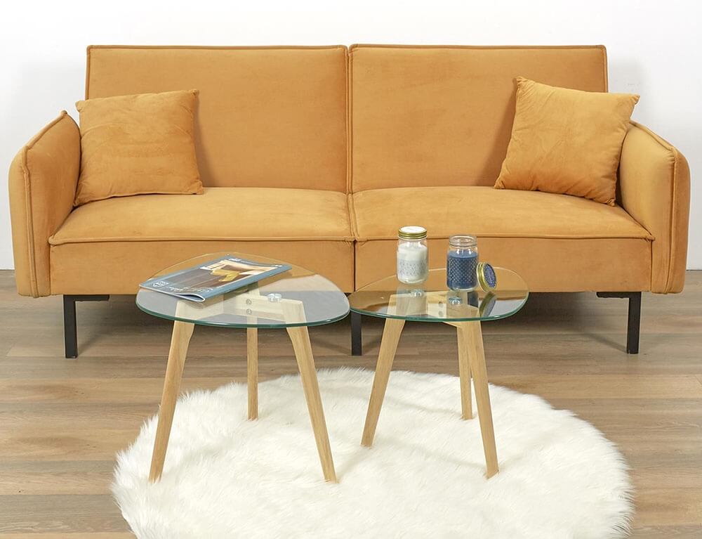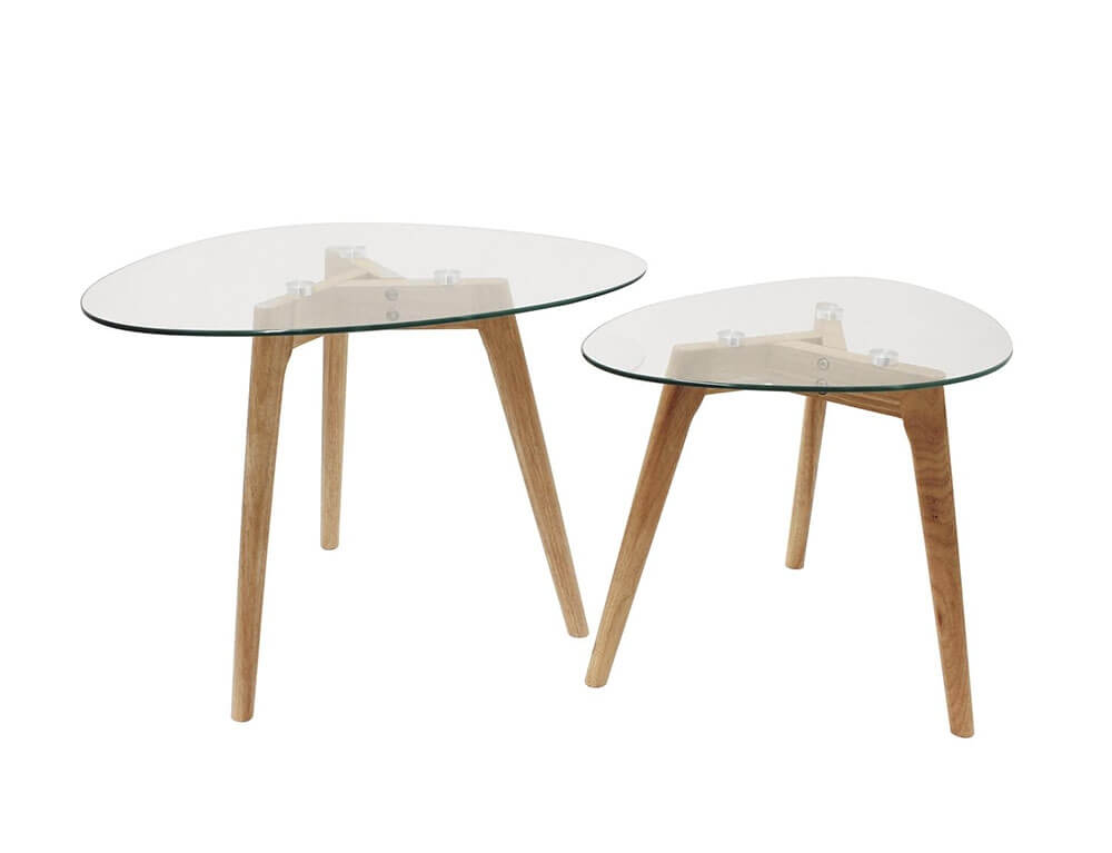 Το σετ τραπεζάκια σαλονιού από τη Home Deco Factory συνδυάζει κομψό σχεδιασμό με πρακτική λειτουργικότητα, προσθέτοντας μια αίσθηση πολυτέλειας και μινιμαλισμού στο χώρο σας. Το ακανόνιστο τους σχήμα δημιουργεί μια αίσθηση ρευστότητας και ευκολίας στο χώρο, ενώ το γυαλί στην επιφάνεια αυξάνει τη διαφάνεια και αναδεικνύει την κομψότητα του σχεδιασμού. Η επιφάνεια των τραπεζιών είναι κατασκευασμένη από σκληρυμένο γυαλί, ενώ τα πόδια του τραπεζιού είναι κατασκευασμένα από ξύλο.