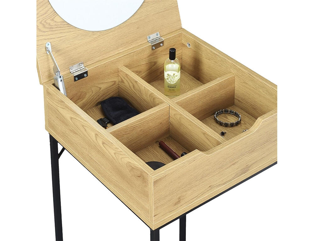 Η κονσόλα Abbott από την Home Deco Factory είναι η ιδανική προσθήκη στο υπνοδωμάτιο ή ακόμα και στο σαλόνι σας. Διαθέτει αποθηκευτικό χώρο για να τοποθετείτε τα καλλυντικά ή τα είδη περιποίησης σας. Έτσι, ο χώρος σας πάντα θα είναι τακτοποιημένος και η προετοιμασία σας θα γίνεται πιο εύκολα. Το πάνελ που καλύπτει το μεγάλο διαμέρισμα της, μπορεί να ανασηκωθεί και να αποκαλύψει έναν καθρέφτη, ιδανικό για το καθημερινό σας styling και μακιγιάζ. Είναι κατασκευασμένη από ξύλο και ο σκελετός είναι κατασκευασμένος από μέταλλο.