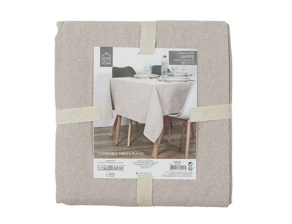 Ανανεώστε και αναδείξτε την τραπεζαρία σας με το τραπεζομάντηλο από την Home Deco Factory. Η μπεζ απόχρωση του θα δώσει μια μοντέρνα και κομψή αίσθηση στο χώρο σας. Είναι κατασκευασμένο από πολυεστέρα και βαμβάκι και καθαρίζεται εύκολα. Για καλύτερη φροντίδα συνίσταται πλύση και σιδέρωμα σε χαμηλές θερμοκρασίες και να μην χρησιμοποιείται κάποιο λευκαντικό.