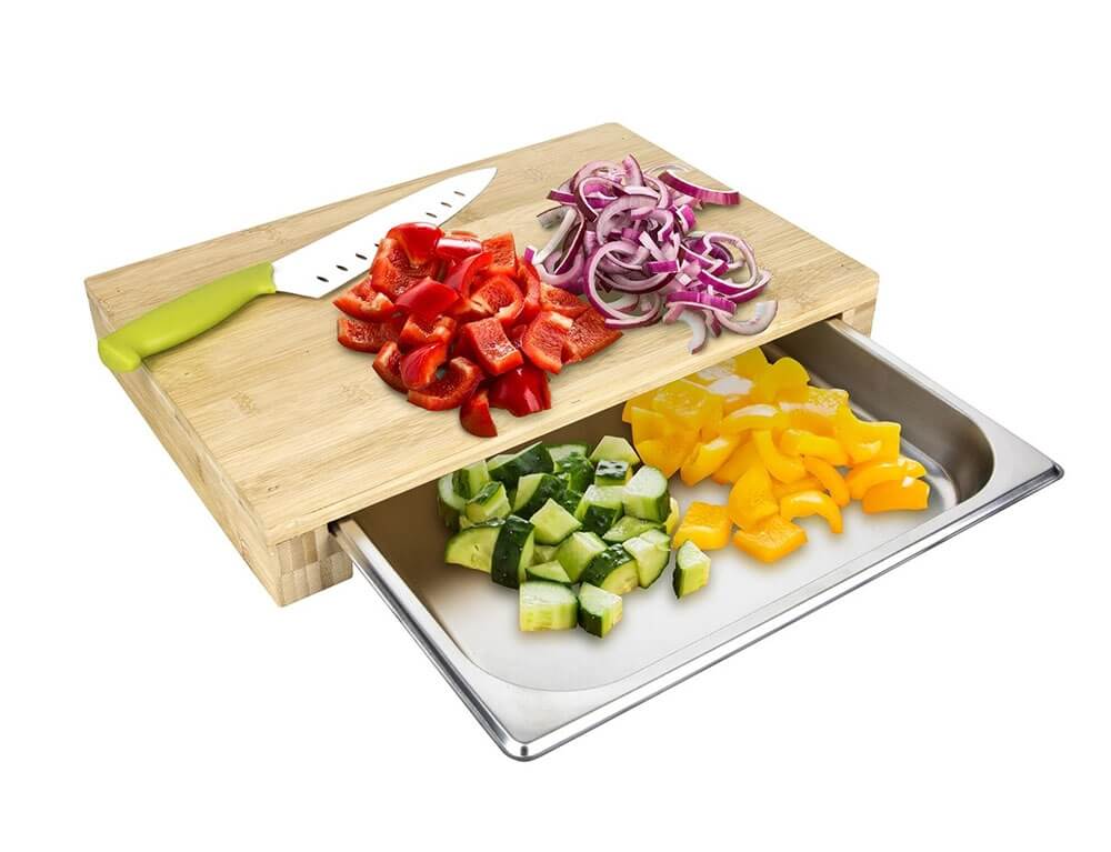 Η επιφάνεια κοπής της εταιρείας Cook Concept, αποτελεί την ιδανική λύση για τον οικιακό εξοπλισμό, για να τεμαχίσετε ή να ψιλοκόψετε οτιδήποτε χρειάζεται κατά την προετοιμασία ενός φαγητού. Το συρτάρι συλλογής από ανοξείδωτο ατσάλι μπορείτε να το σπρώξετε μπροστά αφού ψιλοκόψετε τα λαχανικά σας για να τα ρίξετε εύκολα. Ρίξτε λίγο αλάτι και λάδι πάνω από τα λαχανικά και τοποθετήστε τη μεταλλική λεπίδα απευθείας στο φούρνο, κάνοντας τα πράγματα εύκολα και άνετα. Είναι κατασκευασμένη από μπαμπού, ένα υλικό που το κάνει ελαφρύ και ανθεκτικό, δεν είναι όμως κατάλληλο για πλυντήριο πιάτων.