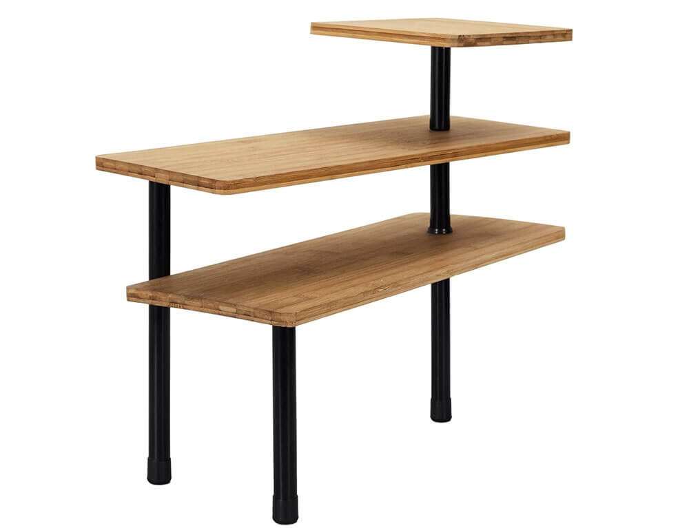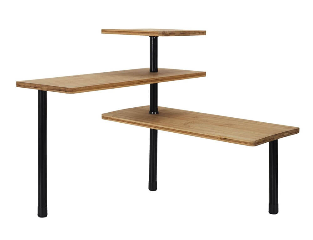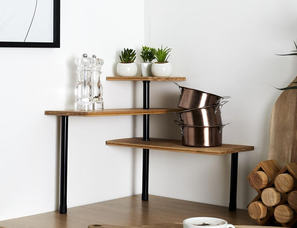 Οργανώστε και διατηρήστε τακτοποιημένη την κουζίνα σας με το γωνιακό ράφι από την Cook Concept. Αποτελείται από 3 ράφια και 4 γάντζους για να κρεμάσετε διάφορα εργαλεία κουζίνας ή κούπες. Είναι κατασκευασμένο από ξύλο μπαμπού και ο σκελετός από πλαστικό.