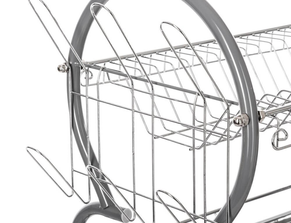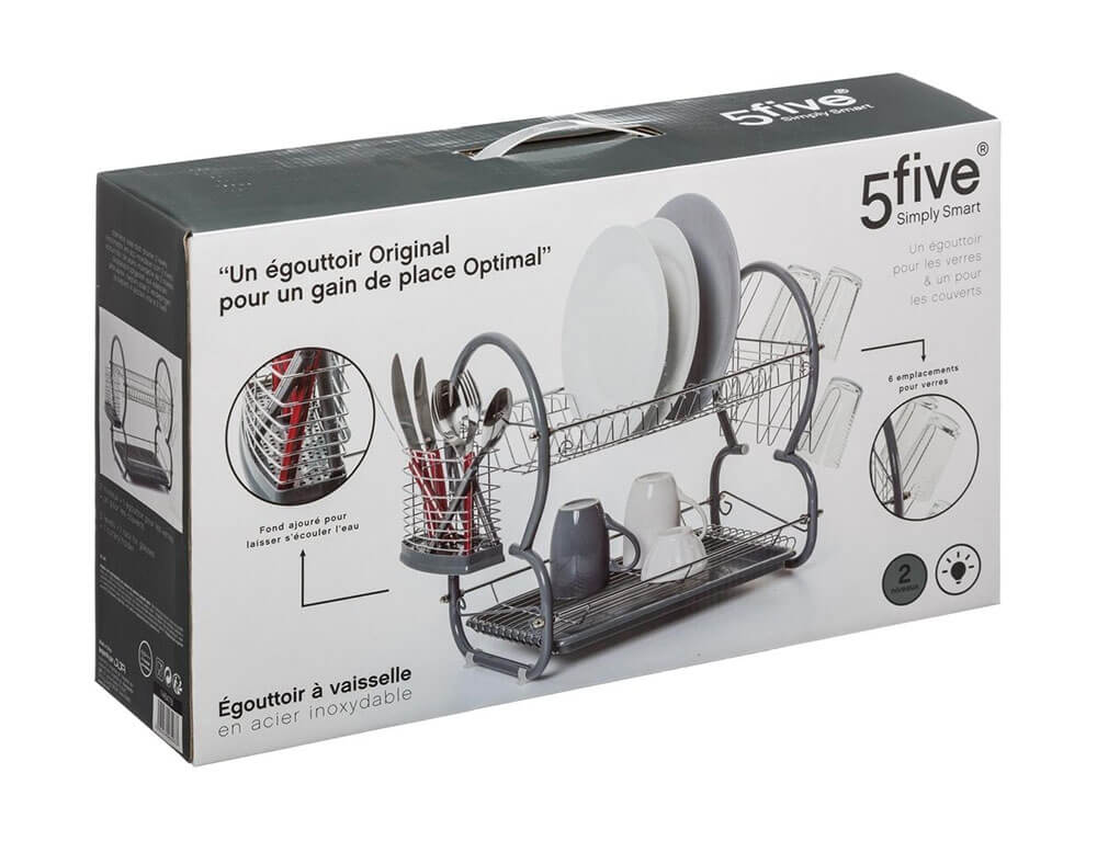 Ανανεώστε και διατηρείστε καθαρή και τακτοποιημένη την κουζίνα σας με την πιατοθήκη από τη 5five. Με δύο επίπεδα και θήκη για μαχαιροπήρουνα και ποτήρια για να χωρέσετε περισσότερα πιάτα και σκεύη, θα μπορείτε να διατηρείτε την τάξη στην κουζίνα σας. Είναι κατάλληλη για πιάτα με διάμετρο μέχρι 30cm και διάφορα μεγέθη ποτηριών. Διαθέτει δίσκο αποστράγγισης για να μην γεμίζει ο πάγκος σας με νερά και διπλή επίστρωση χρώματος για να μην σκουριάζει και να μην απορροφά τη σκόνη.