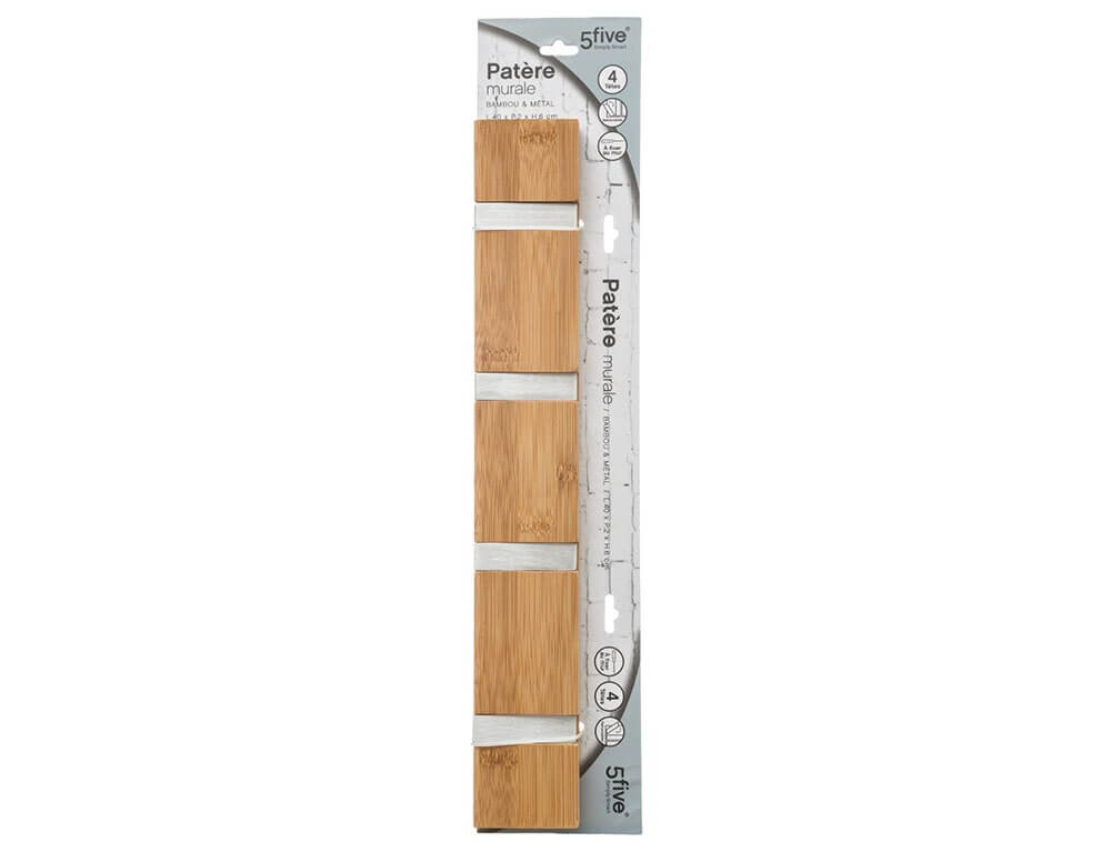 Η κρεμάστρα τοίχου της 5five θα προσθέσει λειτουργικότητα και οργάνωση στο χώρο σας. Mπορείτε να τη χρησιμοποιήσετε για να κρεμάσετε ρούχα, τσάντες, καπέλα, κοσμήματα, πετσέτες ή ό,τι άλλο επιθυμείτε. Τοποθετείται εύκολα με βίδες και αποτελεί μια απλή, πρακτική και εργονομική λύση. Διαθέτει 4 ασημένια γαντζάκια που μπορούν να ανοίγουν και να κλείνουν για έξτρα πρακτικότητα.