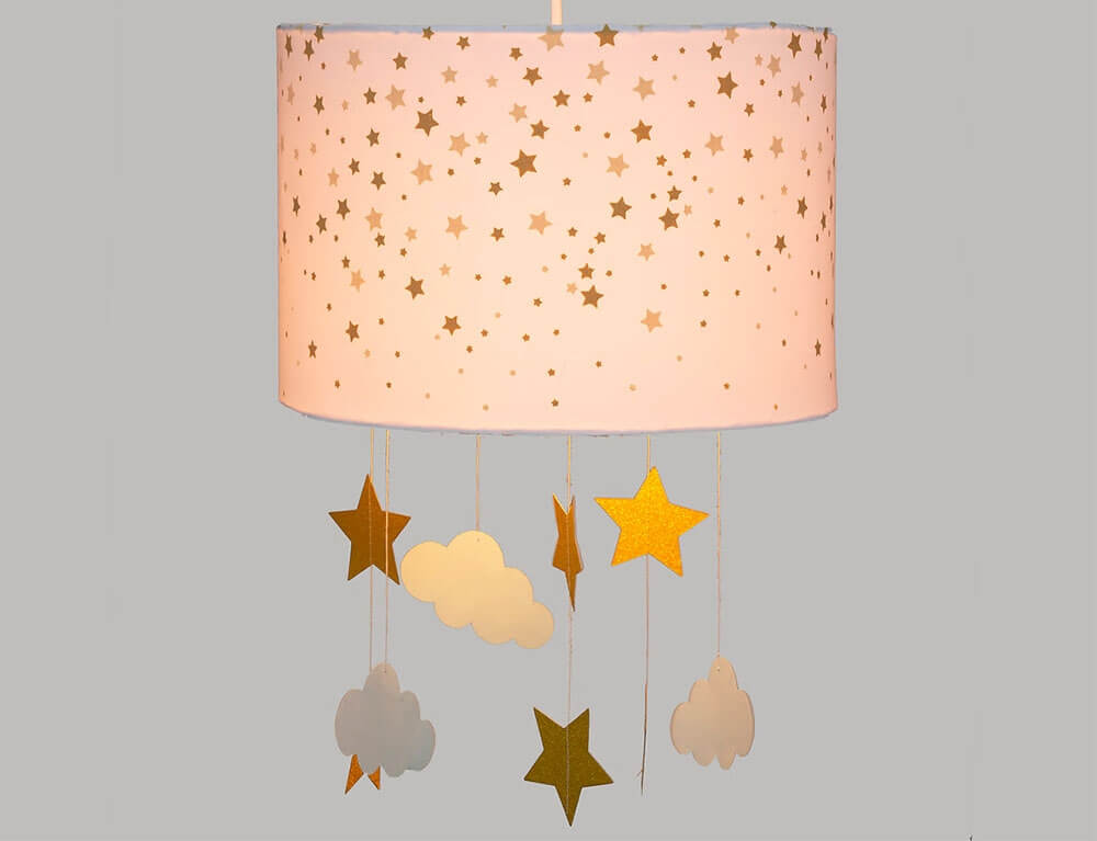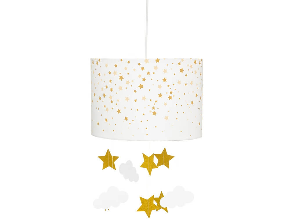 Δώστε άπλετο φως στο παιδικό δωμάτιο, ανανεώνοντας εκπληκτικά το στιλ του με το παιδικό φωτιστικό οροφής από την Atmosphera. Στο κάτω μέρος κρέμονται αστέρια και σύννεφα, στα οποία θα αντανακλά το φως και θα γυαλίζουν. Το καπέλο είναι κατασκευασμένο από 100% πολυεστέρα σε λευκή απόχρωση με χρυσά αστέρια, ενώ ο σκελετός μεταλλικός.