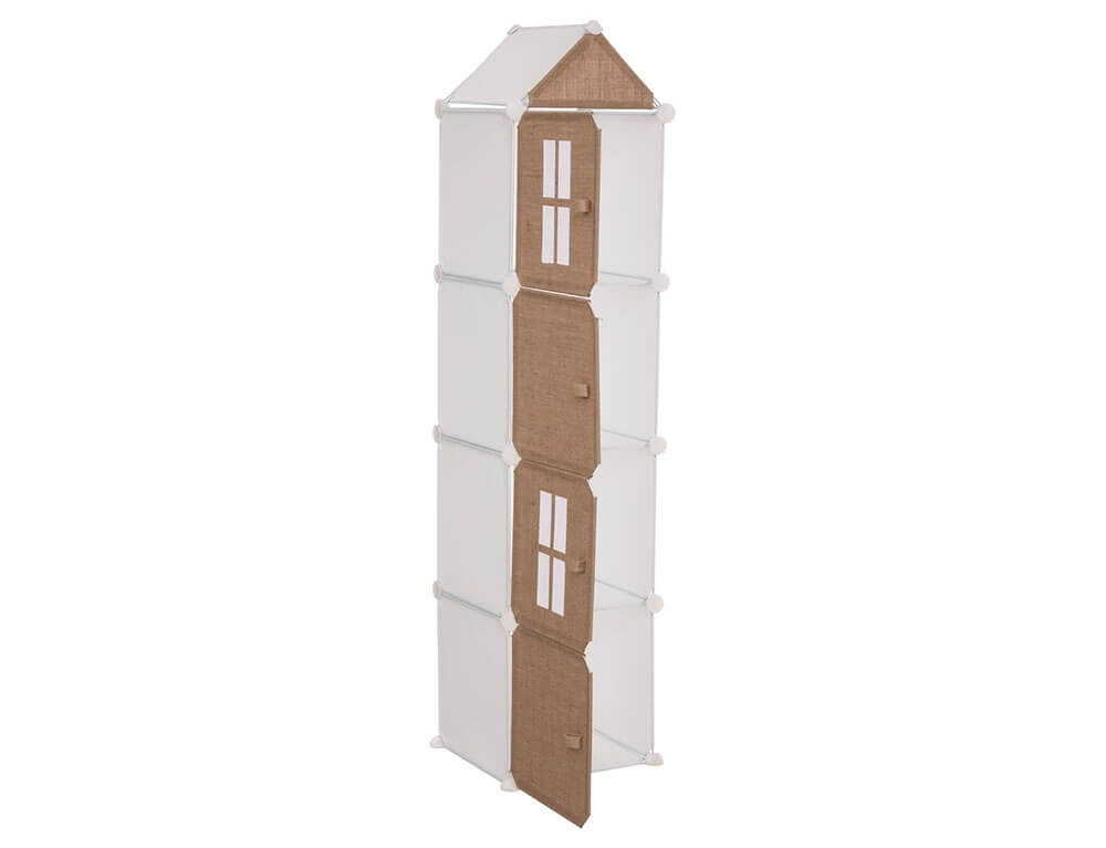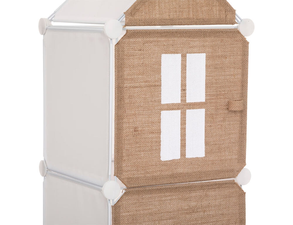 Οργανώστε και διατηρήστε τακτοποιημένο το παιδικό δωμάτιο με το έπιπλο οργάνωσης και αποθήκευσης. Διαθέτει 4 χωρίσματα, μέσα στα οποία μπορείτε να αποθηκεύσετε παιχνίδια, βιβλία ή αρκουδάκια. Η καφέ απόχρωση και το σχέδιο κάστρου που έχει θα δώσει μια παιχνιδιάρικη αισθητική στο παιδικό δωμάτιο. Κάθε κουτί διαθέτει πορτάκι για να αποθηκεύει το παιδί σας τα πράγματά του. Είναι κατασκευασμένo από μεταλλικό σκελετό και λεπτομέρειες πλαστικού και πολυπροπυλένιου με πρόσοψη από γιούτα σε φυσική απόχρωση.