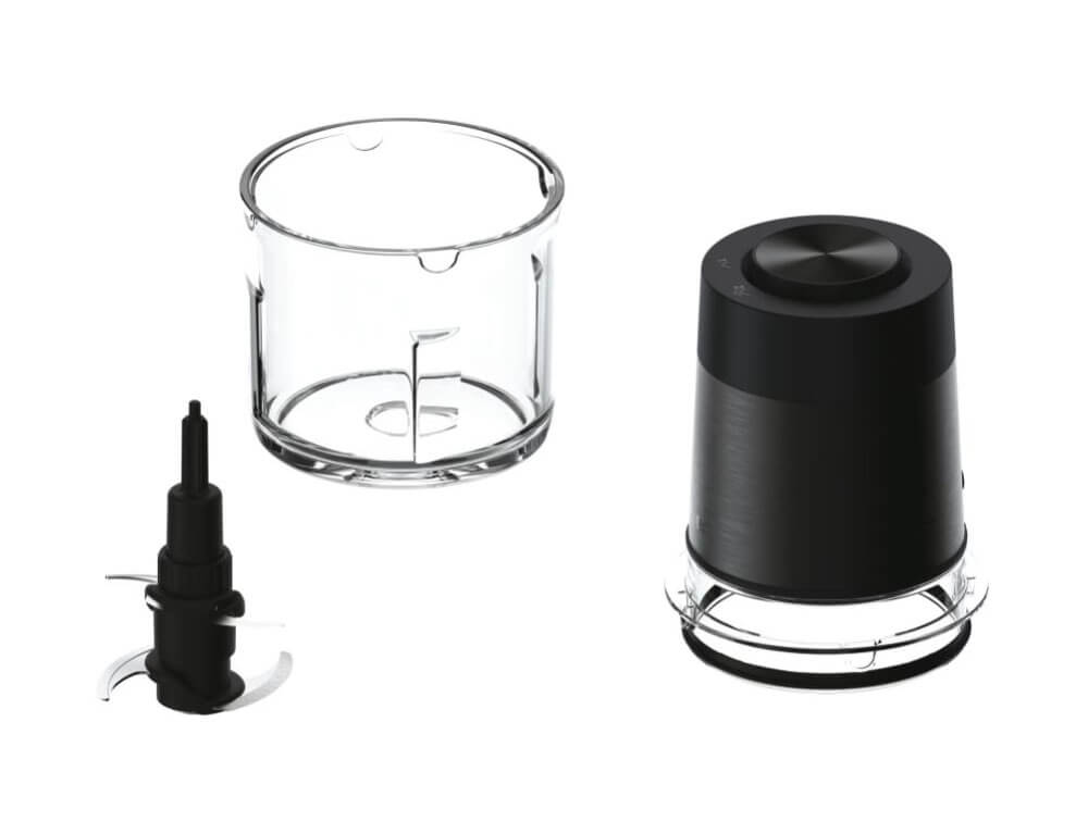 Διαθέτει κρυστάλλινο δοχείο, πολύ υψηλής αντοχής, για την επεξεργασία των υλικών που μπορεί να πλυθεί ακόμη και στο πλυντήριο πιάτων. Κατά τη χρήση τοποθετείται επάνω σε προστατευτική, αντιολισθητική βάση απο καουτσούκ που περιέχεται στη συσκευασία.