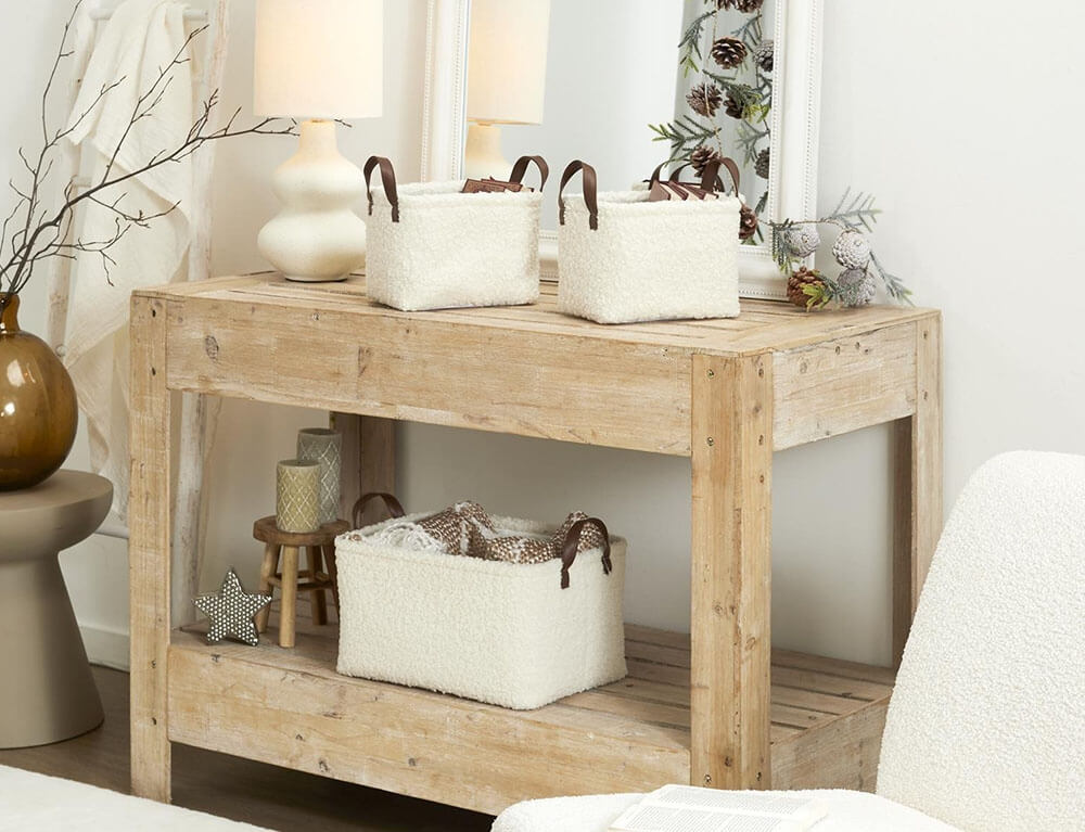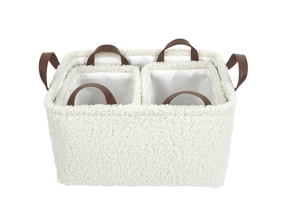 Το σετ διακοσμητικών καλαθιών σε τετράγωνο σχήμα σε πλέξη boucle αποτελείται από 3 τεμάχια διαφορετικού μεγέθους. Μπορούν να λειτουργήσουν σαν διακοσμητικά στοιχεία σε οποιαδήποτε γωνία του σπιτιού σας αλλά και σαν αποθηκευτικός χώρος. Ιδανικό για να κρατήσει οργανωμένα τα μικροαντικείμενα, τα περιοδικά και ότι άλλο φανταστείτε, δίνοντας παράλληλα μια φρέσκια ανάσα στο χώρο σας.