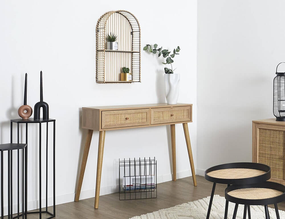 Με την κονσόλα Bali από τη Home Deco Factory θα καλύψετε τις ανάγκες σας για τακτοποίηση και θα δώσετε ιδιαίτερο στυλ και χαρακτήρα στο χώρο σας. Μπορείτε να την τοποθετήσετε σε οποιοδήποτε χώρο του σπιτιού σας και συνδυάζεται ιδανικά με ένα πίνακα ή καθρέπτη και διάφορα διακοσμητικά. Διαθέτει 2 συρτάρια για να τακτοποιείτε και να αποθηκεύετε τα πράγματά σας. Στηρίζεται σε 4 στιβαρά πόδια που δένουν αρμονικά με το σύνολο, ενώ η επένδυση rattan θα δώσει μια φυσικότητα στο χώρο σας..