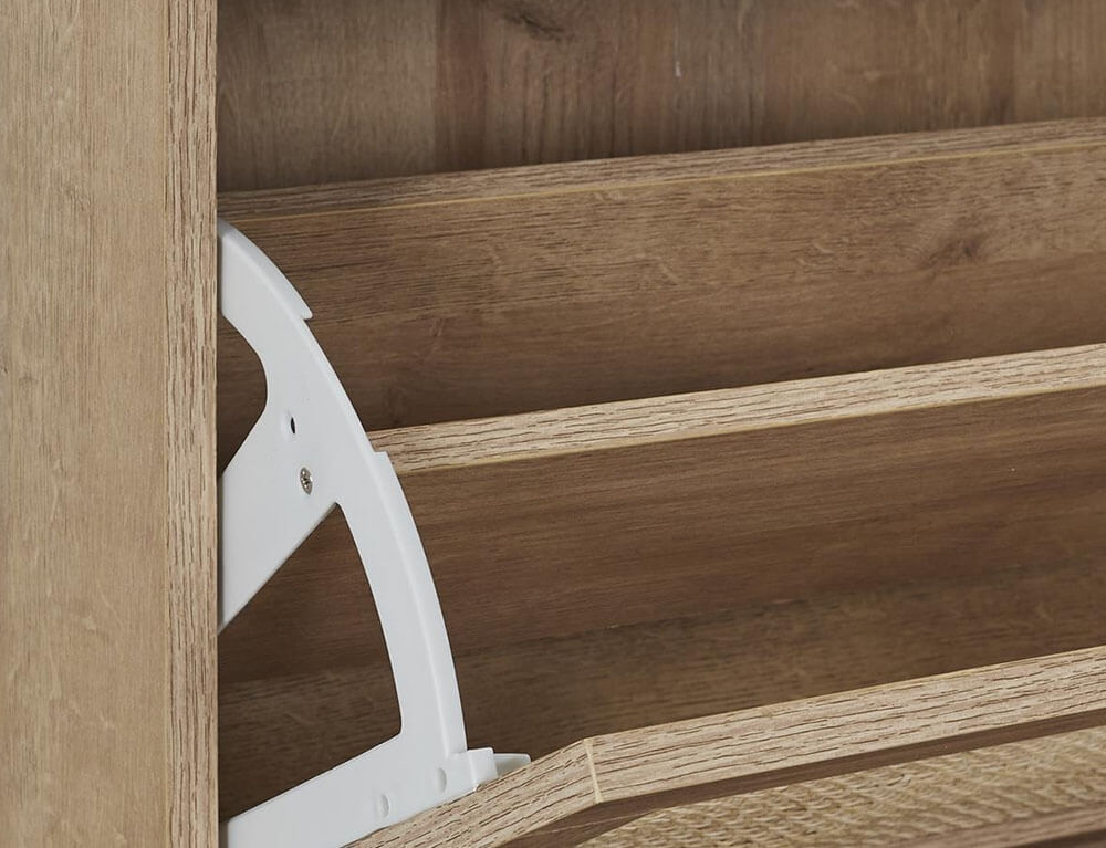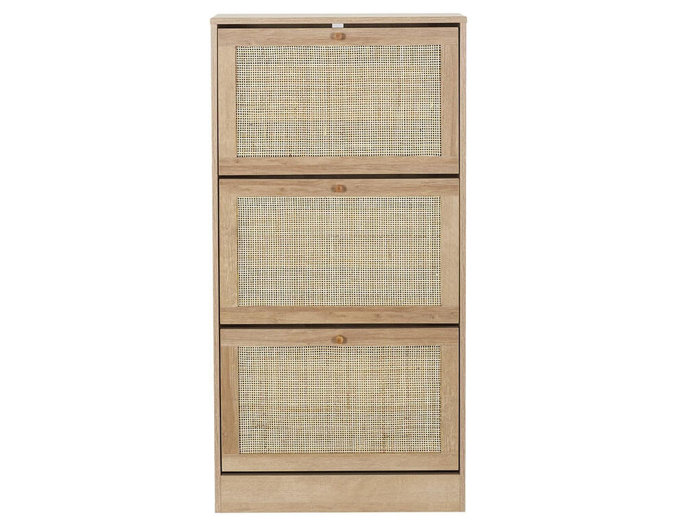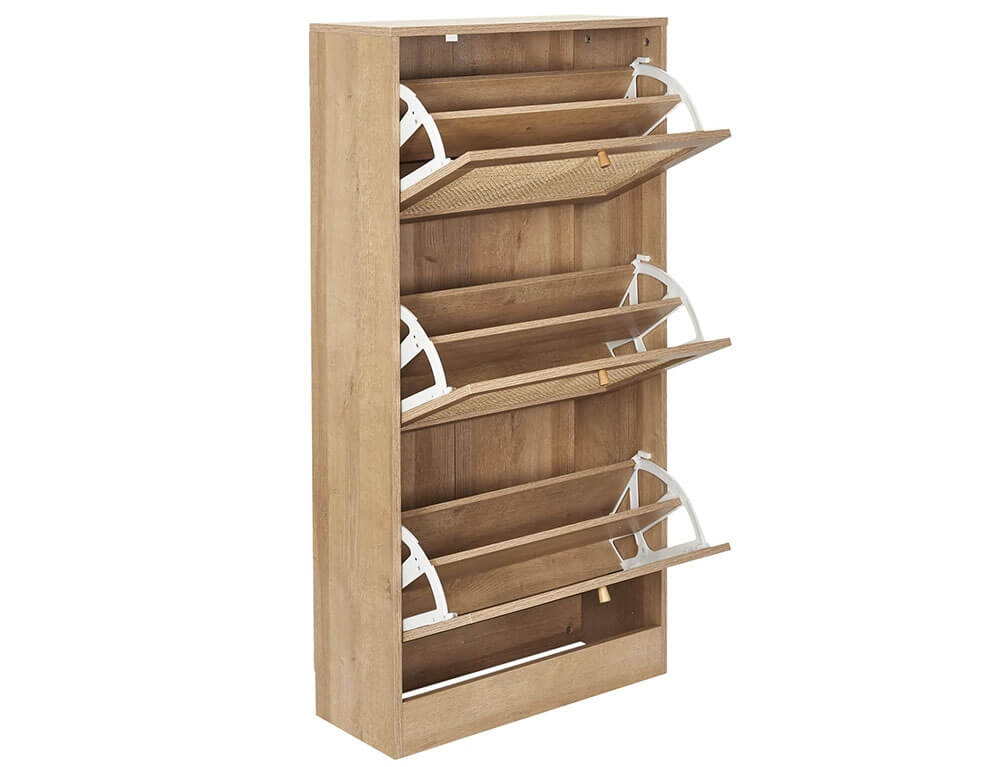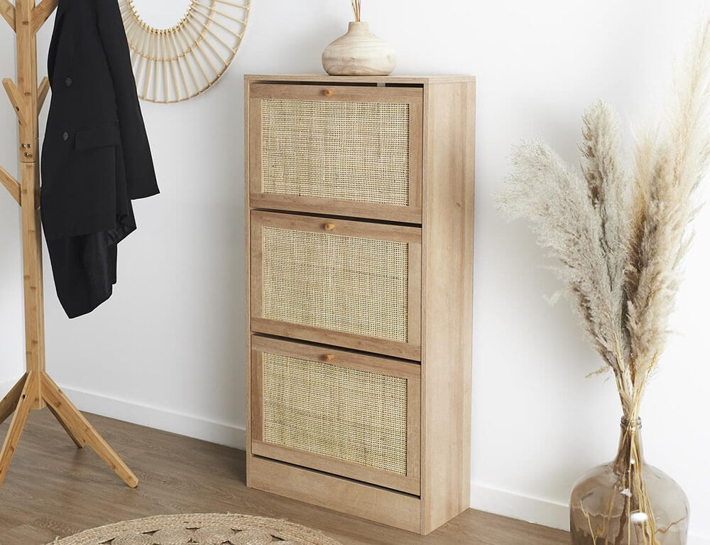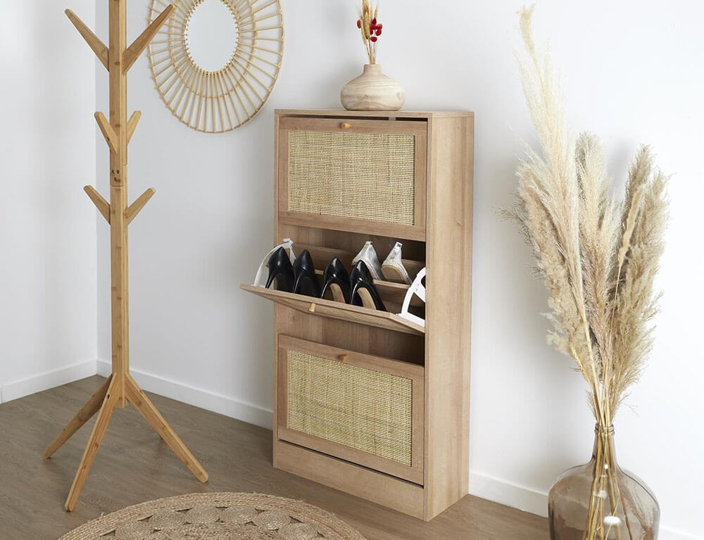 Οργανώστε τα παπούτσια σας και κρατήστε το χώρο σας τακτοποιημένο με μια παπουτσοθήκη. Διαθέτει 3 ράφια και κάθε ράφι αποτελείται από 2 επίπεδα, στα οποία μπορείτε να τοποθετήσετε από αθλητικά μέχρι ψηλοτάκουνα παπούτσια. Χωράει έως και 18 ζευγάρια παπούτσια και με την επένδυση rattan θα δώσει μια νότα φυσικότητας και μινιμαλισμού στο χώρου σας.