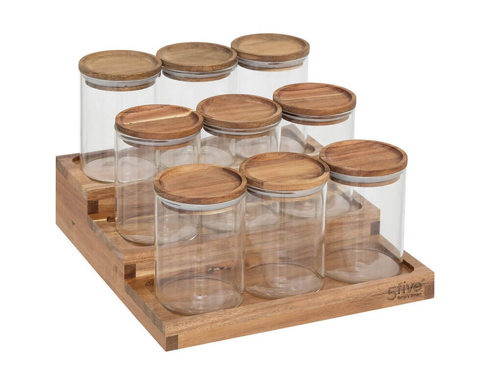 Οργανώστε και τακτοποιήστε τα μπαχαρικά σας με το σετ δοχείων από τη 5five. Το σετ αποτελείται από 12 δοχεία για μπαχαρικά και μια βάση, η οποία δεν καταλαμβάνει πολύ χώρο στον πάγκο ή το ντουλάπι σας. Τα δοχεία έχουν χωρητικότητα 180ml το καθένα και κλείνουν αεροστεγώς, χάρη στη σιλικόνη, ώστε τα μπαχαρικά σας να παραμένουν φρέσκα χωρίς να χάνουν το άρωμά τους για μεγάλο χρονικό διάστημα. Η βάση και τα καπάκια είναι κατασκευασμένα από ξύλο ακακίας και τα δοχεία από βοροπυριτικό γυαλί.