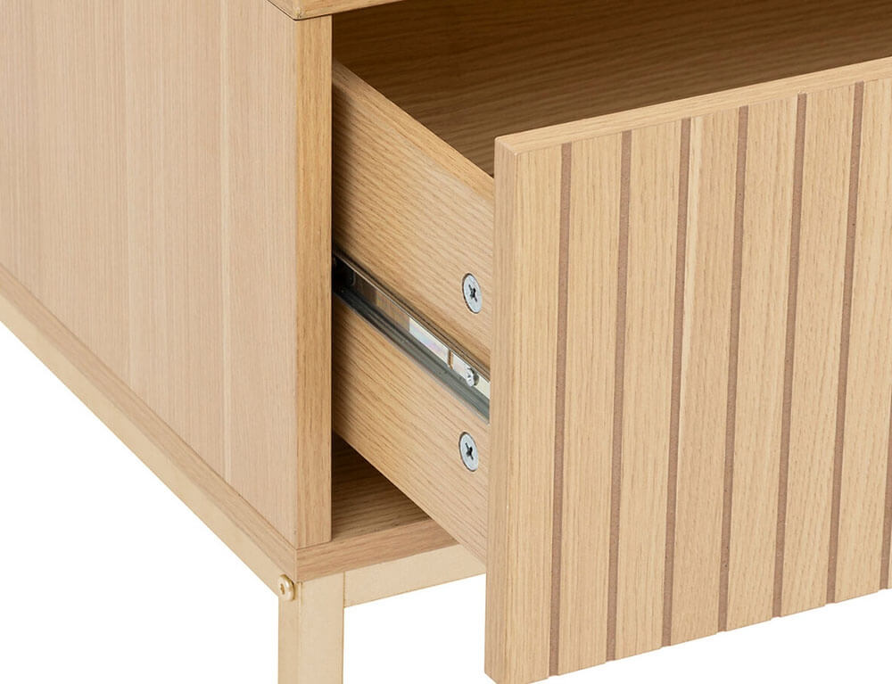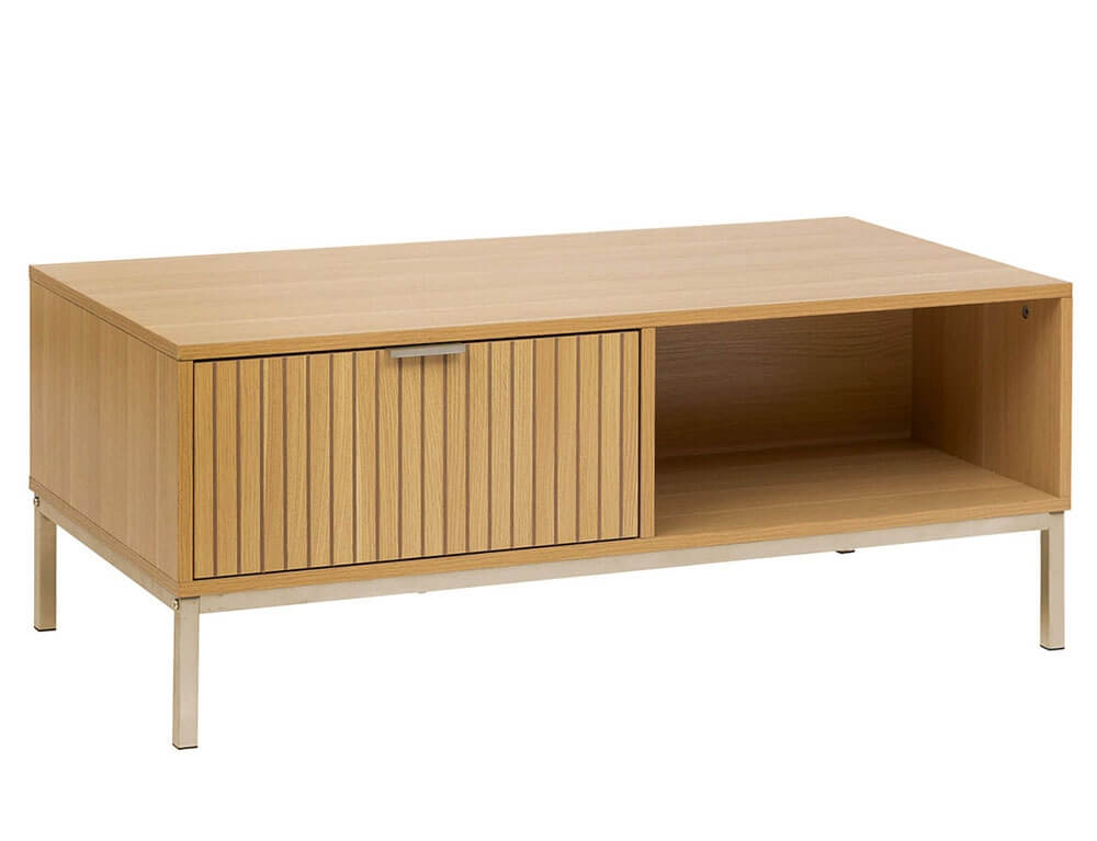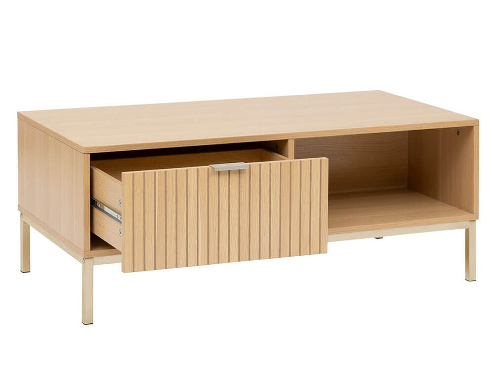 Το τραπεζάκι σαλονιού Tasso από τη 5five συνδυάζει κομψό σχεδιασμό με πρακτική λειτουργικότητα, προσθέτοντας μια αίσθηση πολυτέλειας και μινιμαλισμού στο χώρο σας. Διαθέτει ένα συρτάρι και ένα ράφι για να διατηρείτε το χώρο σας οργανωμένο και τακτοποιημένο. Ο σκελετός του είναι κατασκευασμένος από μοριοσανίδα, ένα ανθεκτικό υλικό στα χτυπήματα και στο χρόνο και στηρίζεται σε 4 στιβαρά πόδια από μέταλλο που δένουν αρμονικά με το σύνολο.