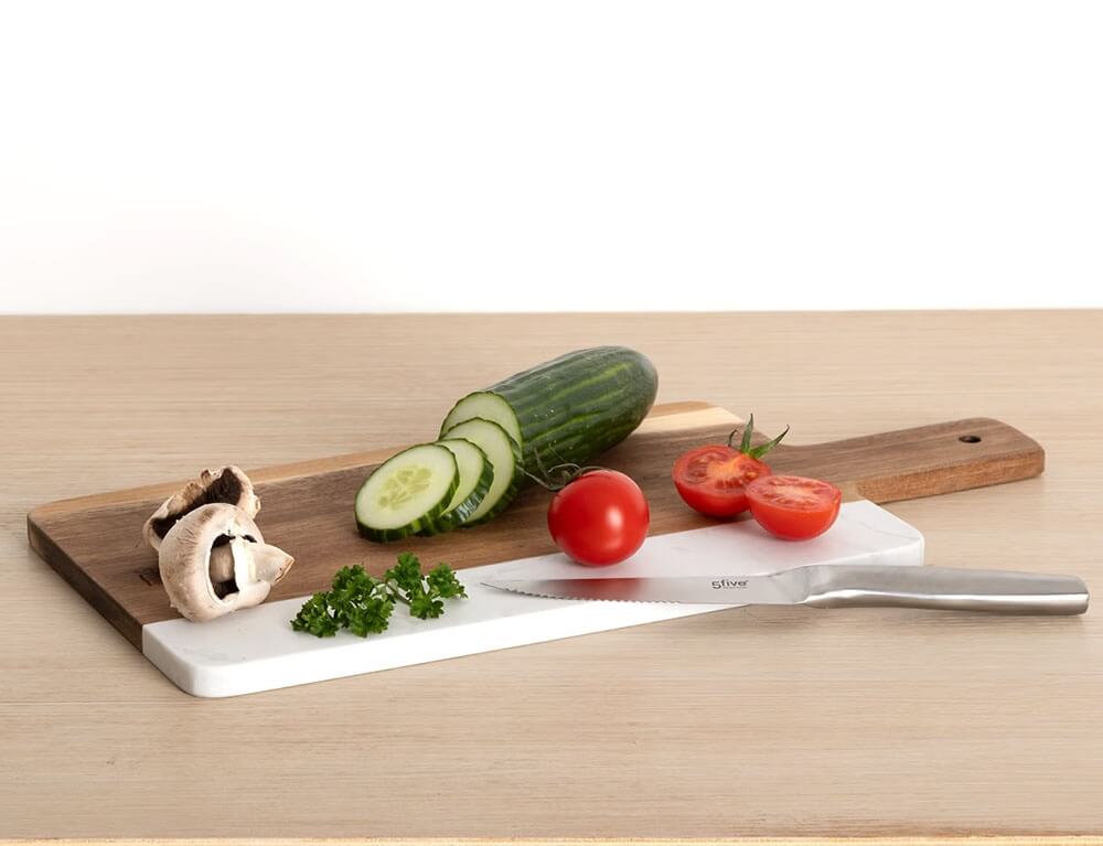 Ο δίσκος σερβιρίσματος της εταιρείας 5five αποτελεί ένα πρακτικό στοιχείο για το σπίτι σας, αφού μπορείτε να σερβίρετε ότι θέλετε ή ακόμα να τον έχετε και ως διακοσμητικό στην κουζίνα ή στο τραπέζι σας. Το ξύλο ακακίας, με την έντονη ζεστασιά και τα μοναδικά νερά του, προσφέρει μια αίσθηση φυσικότητας και κομψότητας, ενώ το μάρμαρο προσθέτει μια αίσθηση πολυτέλειας, αναδεικνύοντας τα πιάτα σας με τρόπο εκλεπτυσμένο. Ιδανικό για όλα τα είδη γευμάτων, από ορεκτικά έως γλυκά.