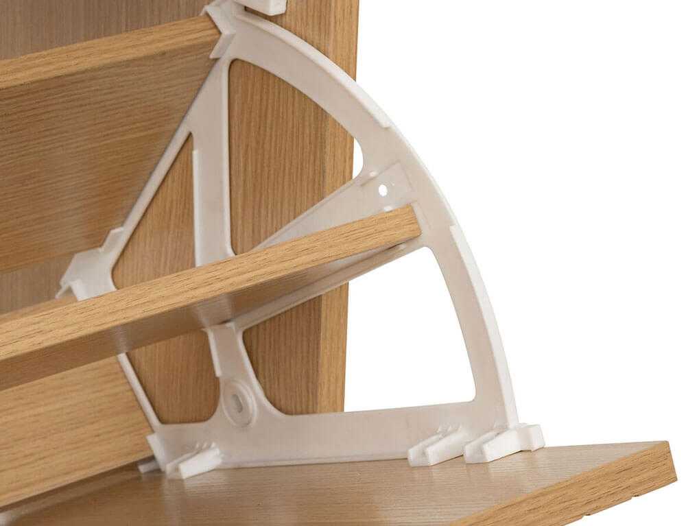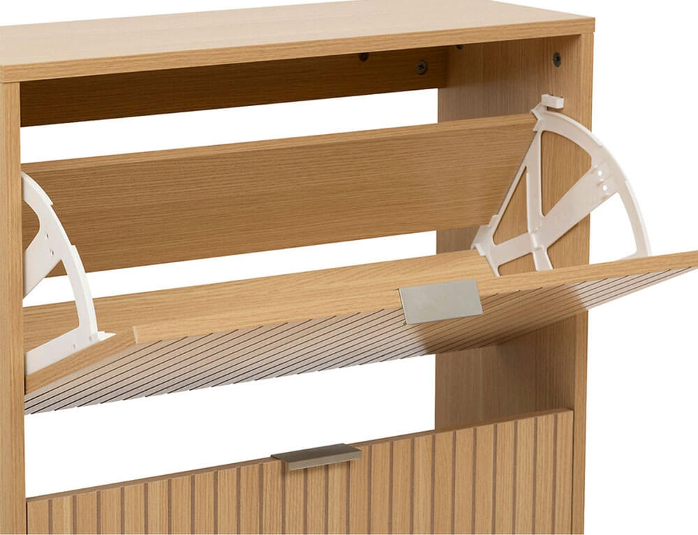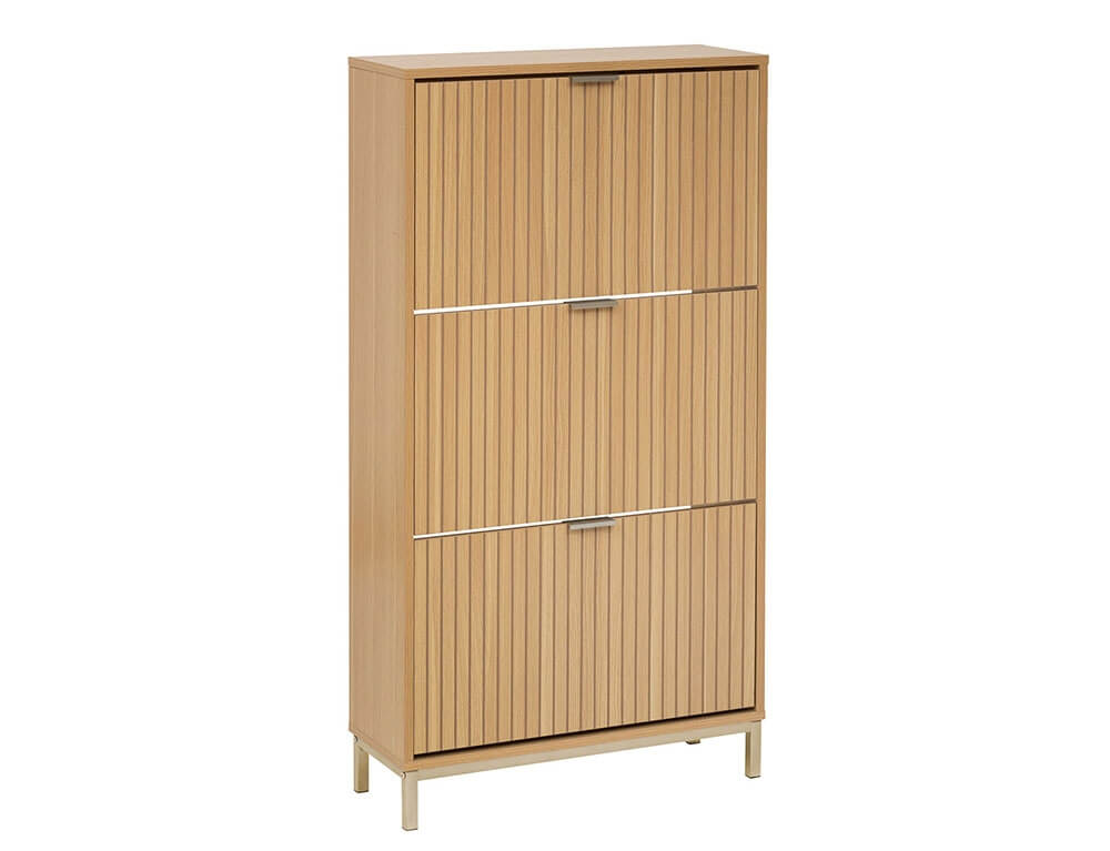 Οργανώστε τα παπούτσια σας και κρατήστε το χώρο σας τακτοποιημένο με την παπουτσοθήκη Tasso από τη 5five. Διαθέτει 3 ράφια και κάθε ράφι αποτελείται από 2 επίπεδα, στα οποία μπορείτε να τοποθετήσετε από αθλητικά μέχρι ψηλοτάκουνα παπούτσια. Χωράει έως και 18 ζευγάρια παπούτσια και θα δώσει μια νότα φυσικότητας και μινιμαλισμού στο χώρου σας. Είναι κατασκευασμένη από MDF με σχέδιο λεπτές, ευθείες γραμμές κατά μήκος της πόρτας, το οποίο προσθέτει επιπλέον ομορφιά και στηρίζεται σε 4 στιβαρά πόδια από μέταλλο που δένουν αρμονικά με το σύνολο.