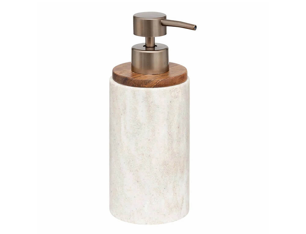 Ανανεώστε την αισθητική του μπάνιου σας και δώστε μια ιδιαίτερη πινελιά με το δοχείο κρεμοσάπουνου από την 5five με εφέ μαρμάρου και καφέ ξύλινη λεπτομέρεια. Είναι κατασκευασμένο από κεραμικό υλικό με μεταλλικό καπάκι.