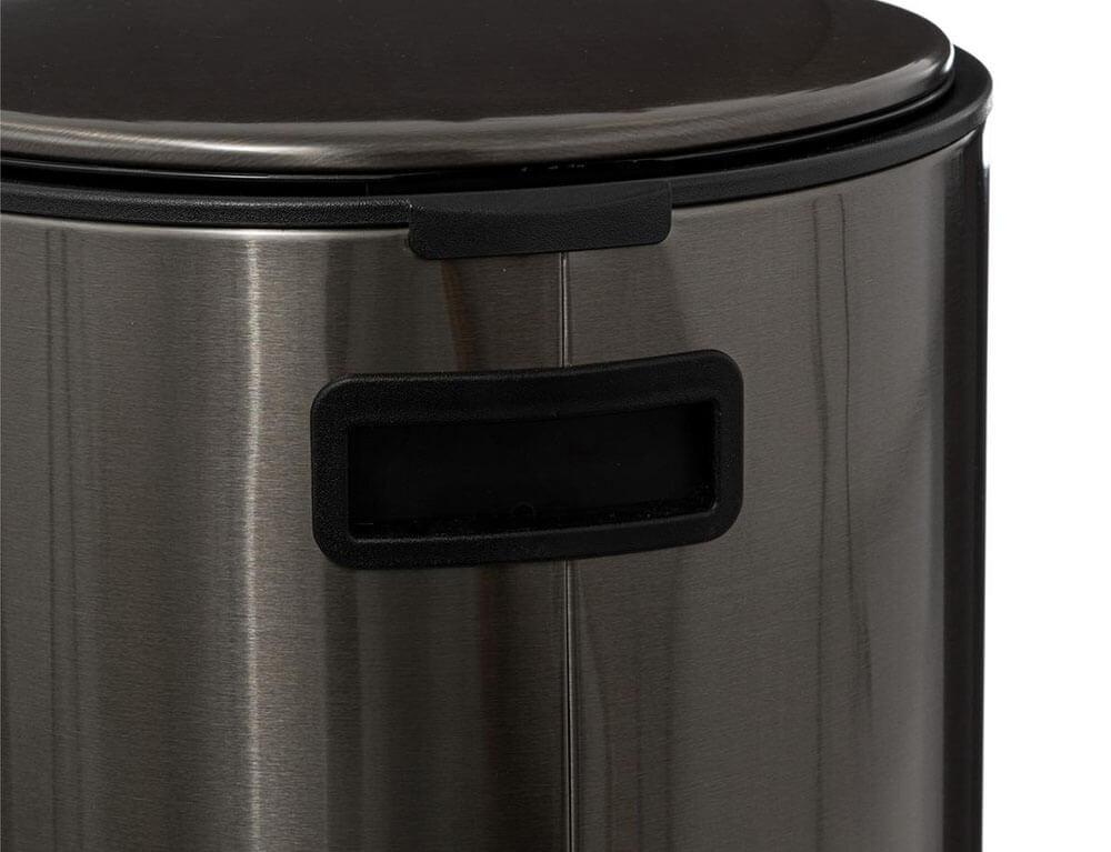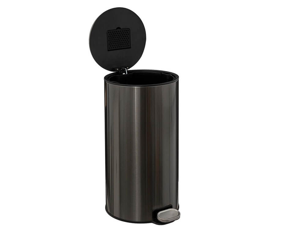 Kάδος απορριμάτων από τη 5five με χωρητικότητα 30 λίτρα. Διαθέτει φίλτρο ενεργού άνθρακα, το οποίο εξουδετερώνει οποιαδήποτε δυσάρεστη οσμή. Είναι κατασκευασμένος από μέταλλο, διαθέτει ανθεκτική κατασκευή με πεντάλ και καπάκι που κλείνει αργά χωρίς να προκαλεί θόρυβο. Εσωτερικά διαθέτει πλαστικό κάδο που αφαιρείται εύκολα, ώστε να τον πλένετε και να τον επανατοποθετείτε. Στο πίσω μέρος διαθέτει λαβή για πιο εύκολη μεταφορά.