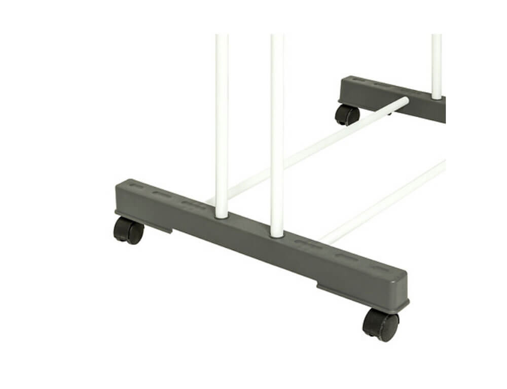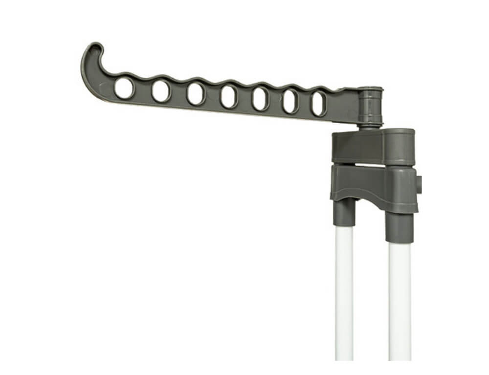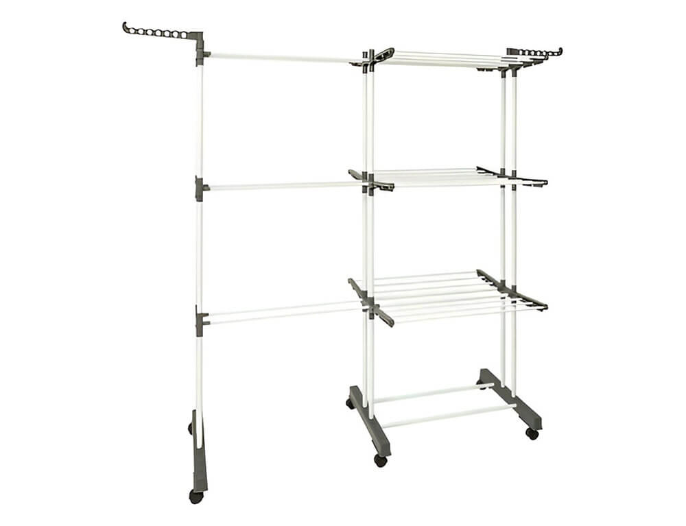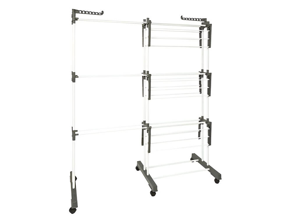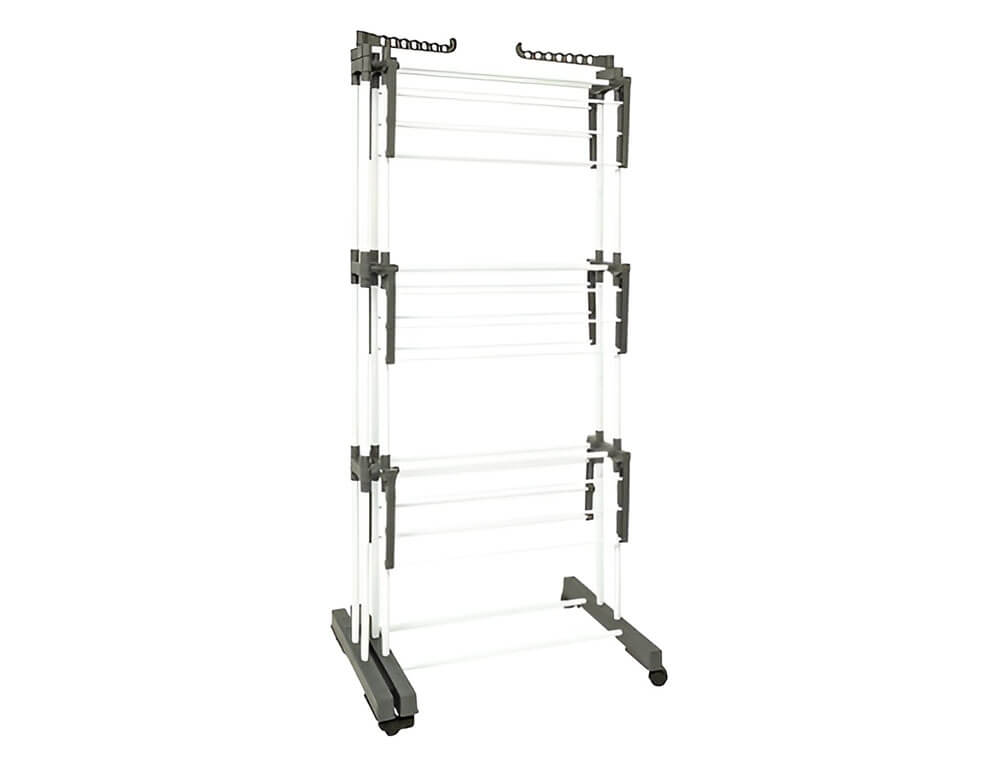 Πτυσσόμενη απλώστρα δαπέδου από την εταιρεία 5five. Με συνολικό μήκος απλώματος 26 μέτρα και 3 επίπεδα, χωράει τα ρούχα, τις πετσέτες ή τα σεντόνια σας. Eπίσης, επεκτείνεται και έχει 3 ράγες για να κρεμάσετε ρούχα και στο πάνω μέρος διαθέτει 2 θήκες όπου μπορείτε να κρεμάσετε 14 κρεμάστρες συνολικά. Διαθέτει 6 ροδάκια για πιο εύκολη μετακίνηση. Είναι κατασκευασμένη από ανθεκτικό μεταλλικό υλικό σε λευκό χρώμα με γκρι λεπτομέρειες και διπλώνει ώστε να αποθηκεύεται εύκολα όταν δεν την χρησιμοποιείτε για εξοικονόμηση χώρου.