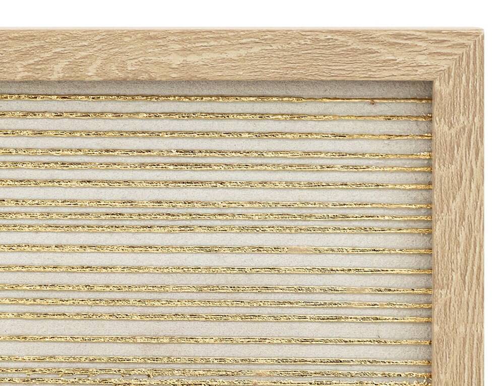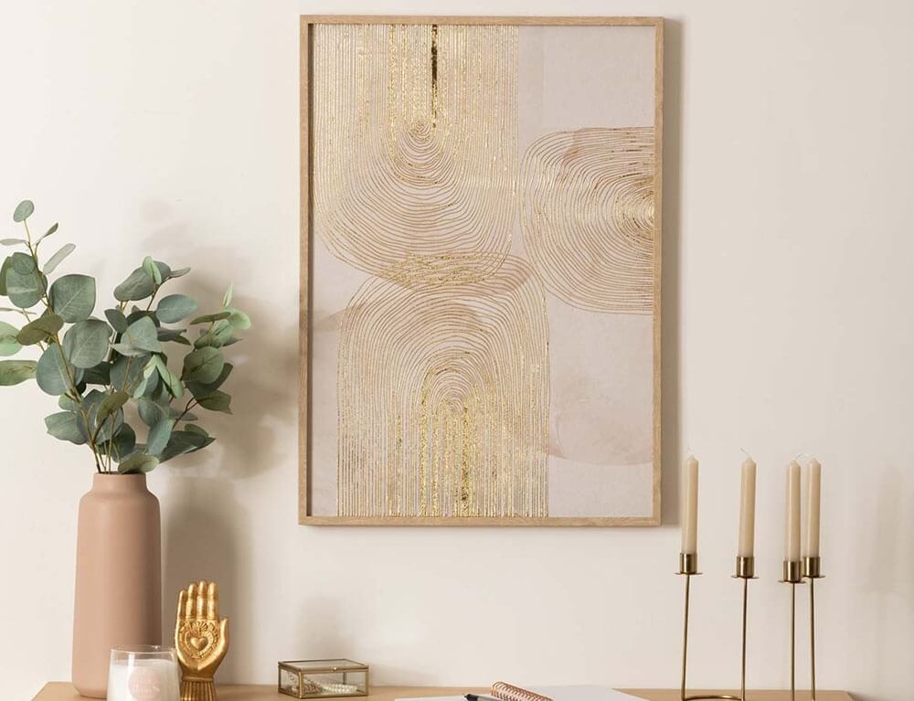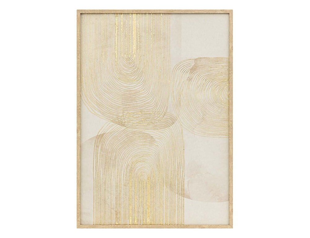 Συμπληρώστε τη διακόσμηση του χώρου σας με τον πίνακα Elin από την Atmosphera. Οι χρυσές γραμμές αναδεικνύουν την τέχνη και προσθέτουν βάθος και κίνηση στο έργο, κάνοντάς το ιδανικό για το σαλόνι, την κρεβατοκάμαρα ή τον επαγγελματικό σας χώρο. Περιμετρικά του καμβά υπάρχει ένα ξύλινο πλαίσιο, το οποίο δημιουργεί μια 3D αίσθηση.