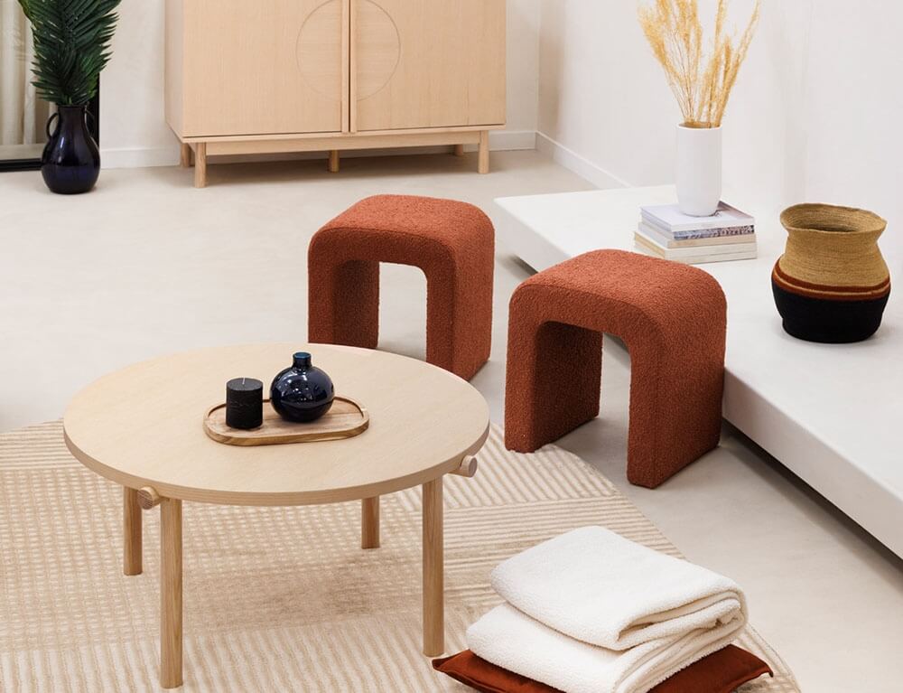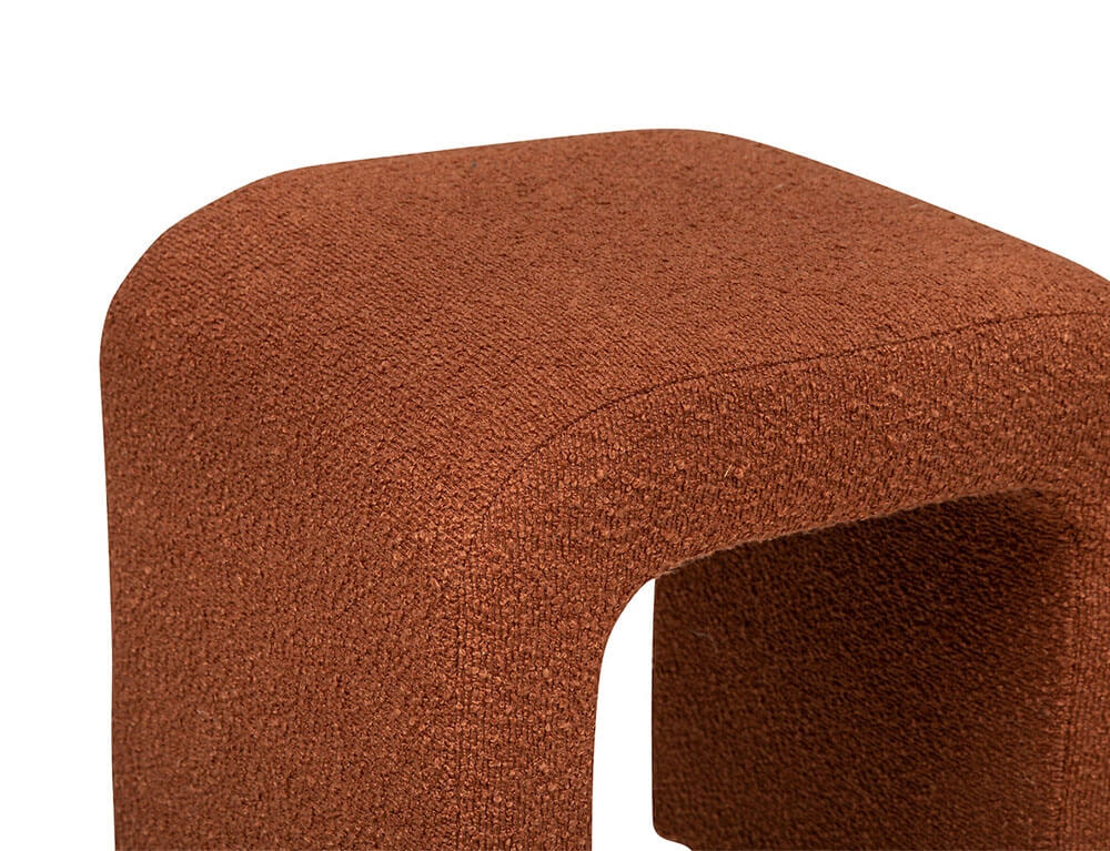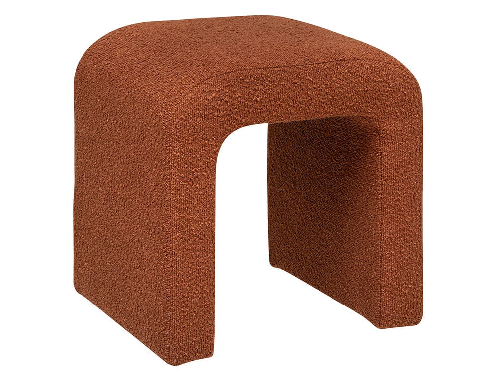 Σκαμπό από πολυεστερικό ύφασμα κόκκινης απόχρωσης σε πλέξη boucle, με αντοχή στη τριβή και στη φθορά. Έχει διακοσμητικό αλλά και χρηστικό χαρακτήρα καθώς μπορείτε να το χρησιμοποιήσετε σαν επιπλέον κάθισμα. Eίναι κατασκευασμένο από ξύλο πεύκου και έχει επένδυση αφρού πολυουρεθάνης (PU).