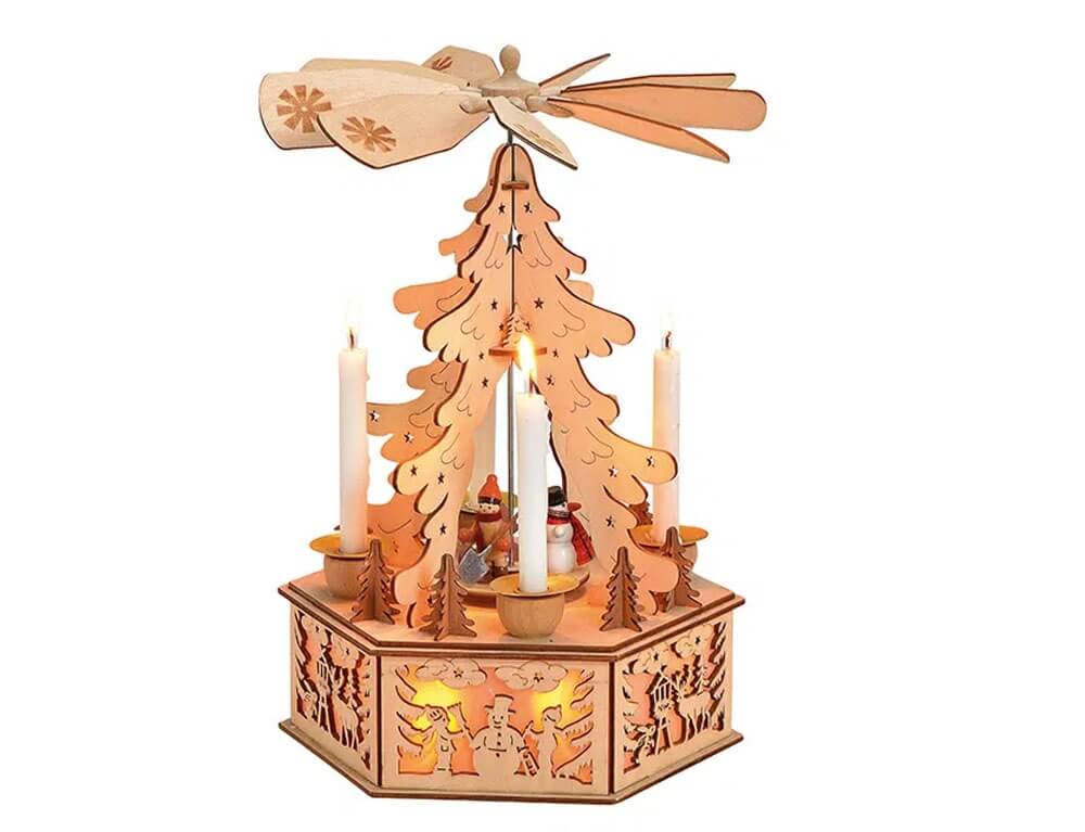 Η πυραμίδα διαθέτει λεπτομερείς χειροποίητες φιγούρες και μια μαγευτική περιστροφή που θα ενθουσιάσει μικρούς και μεγάλους. Αποτελείται από ένα επίπεδο, το οποίο απεικονίζει έναν χιονάνθρωπο και έναν άνθρωπο. Περιμετρικά της υπάρχουν υποδοχές για κεριά και στην κορυφή της πυραμίδας υπάρχει φτερωτή, η οποία περιστρέφεται από το θερμό αέρα που δημιουργείται από τα αναμμένα κεριά. Με την κίνηση της φτερωτής, περιστρέφεται και το επίπεδο της. Το φως των αναμμένων κεριών και τα led που υπάρχουν στη βάση της σε συνδυασμό με τις σκιές που δημιουργούνται από τη φτερωτή θα δημιουργήσουν μια ιδιαίτερη ατμόσφαιρα στο χώρο σας και θα γίνει το επίκεντρο της χριστουγεννιάτικης σας διακόσμησης.