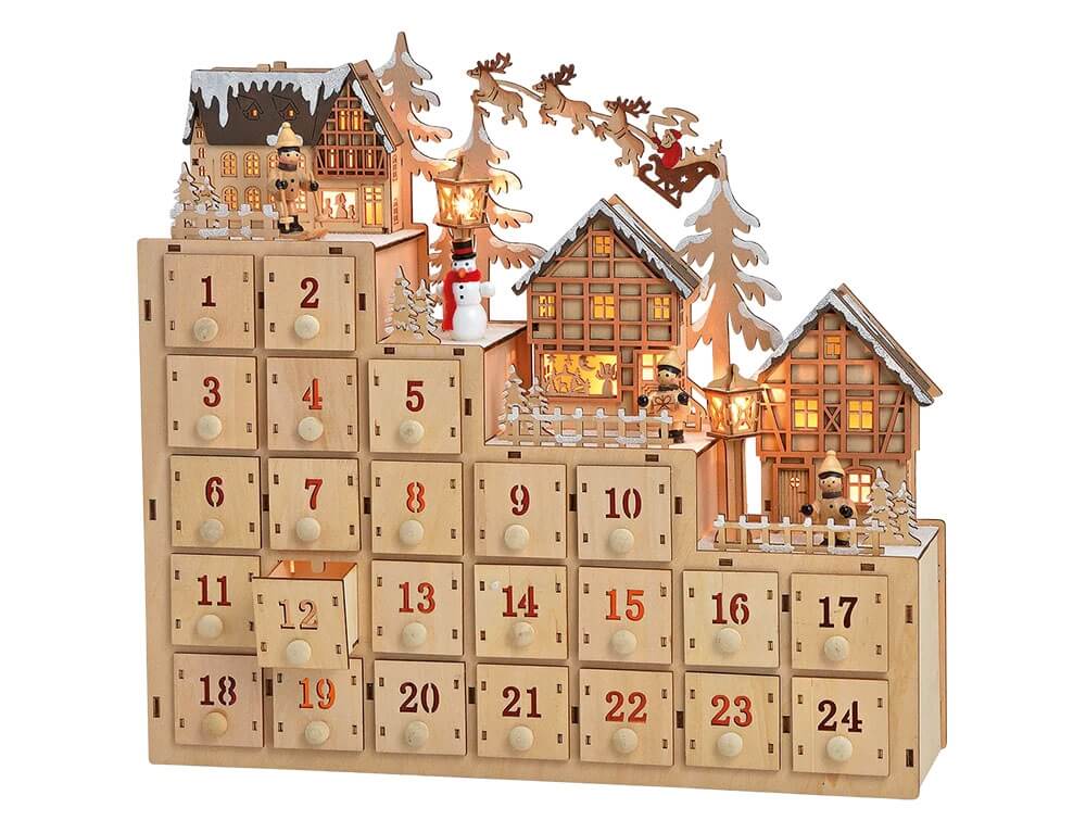 Είναι κατασκευασμένο από ξύλο και απεικονίζει ένα χιονισμένο τοπίο με φιγούρες και σπίτια. Διαθέτει φωτισμό LED για να δημιουργήσει πιο ζεστή ατμόσφαιρα στο χώρο σας. Το ξύλινο ημερολόγιο δεν είναι μόνο λειτουργικό, αλλά και ένα κομψό διακοσμητικό αντικείμενο που θα εμπλουτίσει κάθε γωνιά του σπιτιού σας με χριστουγεννιάτικη αύρα.