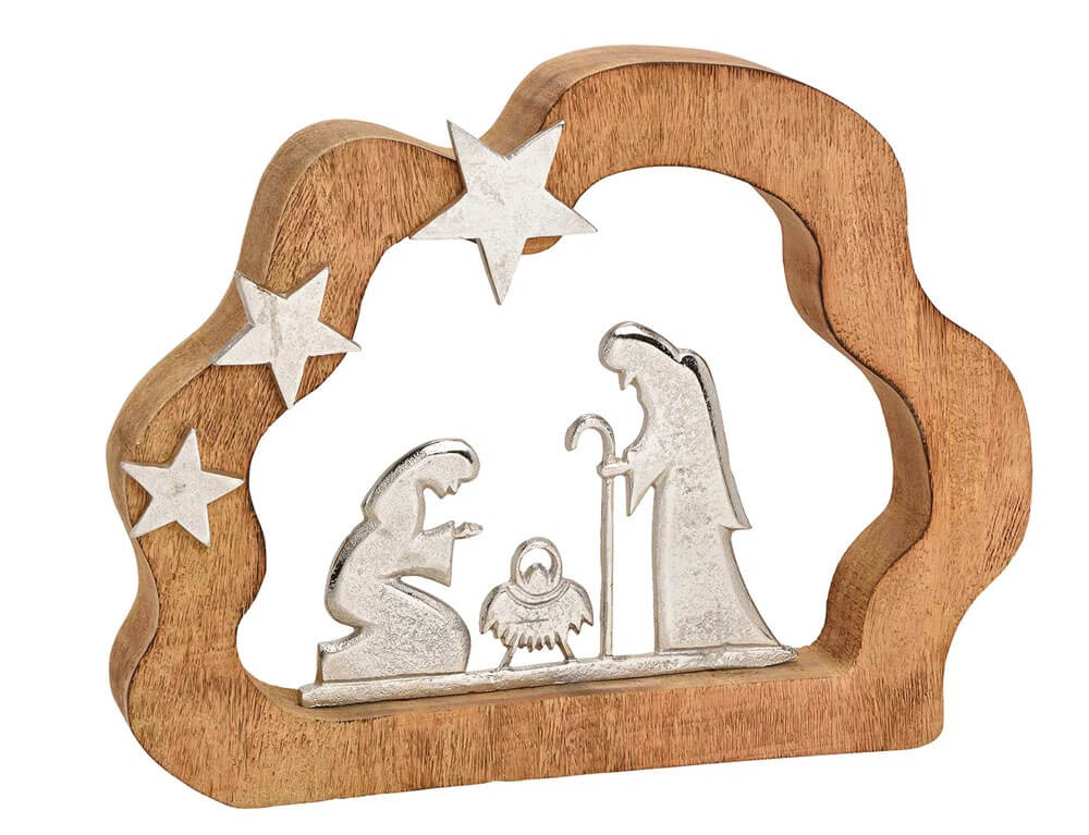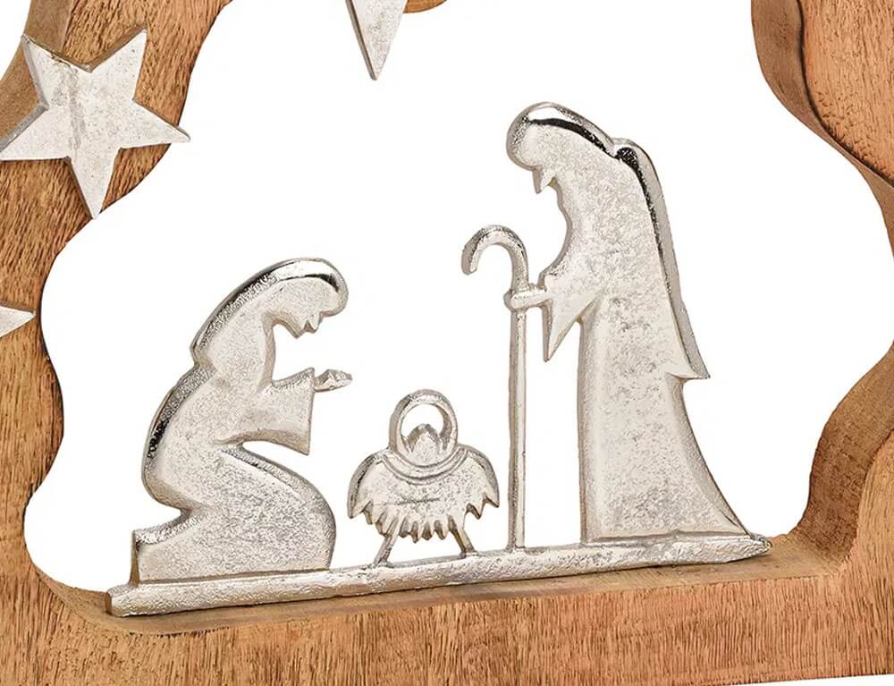 Φέρτε την αίσθηση των γιορτών στο σπίτι σας με τη μοναδική μας διακοσμητική φάτνη! Συνδυάζει τη ρουστίκ ζεστασιά του ξύλου με την αστραφτερή κομψότητα του μετάλλου. Οι φιγούρες, σχολαστικά κατασκευασμένες από μέταλλο, βρίσκονται σε εντυπωσιακή αντίθεση με το ξύλινο σκηνικό, αποτυπώνοντας την ουσία της ιστορίας της γέννησης.