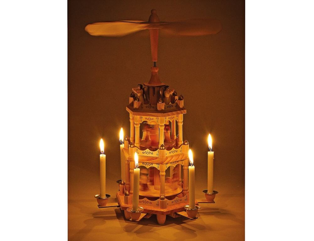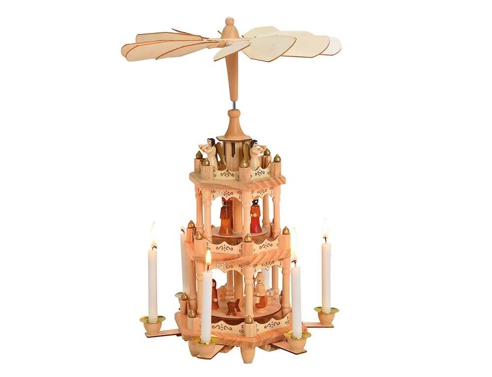 Η πυραμίδα διαθέτει λεπτομερείς χειροποίητες φιγούρες και μια μαγευτική περιστροφή που θα ενθουσιάσει μικρούς και μεγάλους. Αποτελείται από 3 επίπεδα και κάθε επίπεδο αναπαριστά και μια στιγμή από τη γέννηση του Χριστού. Περιμετρικά της υπάρχουν υποδοχές για κεριά και στην κορυφή της πυραμίδας υπάρχει φτερωτή, η οποία περιστρέφεται από το θερμό αέρα που δημιουργείται από τα αναμμένα κεριά. Με την κίνηση της φτερωτής, περιστρέφονται και τα επίπεδα της. Το φως των αναμμένων κεριών σε συνδυασμό με τις σκιές που δημιουργούνται από τη φτερωτή θα δημιουργήσουν μια ιδιαίτερη ατμόσφαιρα στο χώρο σας και θα γίνει το επίκεντρο της χριστουγεννιάτικης σας διακόσμησης.
