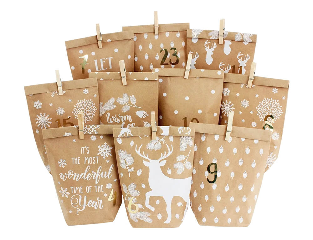 Φέτος, κάντε την αντίστροφη μέτρηση μέχρι τα Χριστούγεννα πιο συναρπαστική από ποτέ! Το ημερολόγιο μας, γεμάτο εκπλήξεις και μαγεία, θα γεμίσει τις ημέρες σας με χαρά και ανυπομονησία. Κάθε μέρα, από την 1η Δεκεμβρίου μέχρι τα Χριστούγεννα, κάθε σακουλάκι κρύβει μια μικρή έκπληξη, ιδανική για να μοιραστείτε στιγμές χαράς με τα αγαπημένα σας πρόσωπα! Μπορείτε να τοποθετήσετε μέσα σοκολατάκια, δώρα, παιχνίδια ή και προτάσεις για διασκεδαστικές δραστηριότητες με την οικογένεια. Tα σακουλάκια είναι φτιαγμένα από χαρτί και διαθέτουν ένα ξύλινο μανταλάκι για να διατηρούνται κλειστά. Μπορείτε να τα τοποθετήσετε όλα μαζί κάτω από το δέντρο ή όπου αλλού θέλετε ή να τα τοποθετήσετε σε διαφορετικά σημεία του σπιτιού.