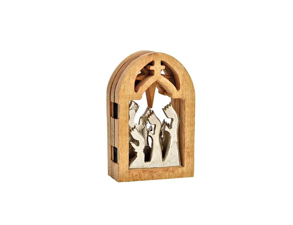 Φέρτε την αίσθηση των γιορτών στο σπίτι σας με τη μοναδική μας διακοσμητική φάτνη! Συνδυάζει τη ρουστίκ ζεστασιά του ξύλου με την αστραφτερή κομψότητα του μετάλλου. Οι φιγούρες, σχολαστικά κατασκευασμένες από μέταλλο, βρίσκονται σε εντυπωσιακή αντίθεση με το ξύλινο σκηνικό, αποτυπώνοντας την ουσία της ιστορίας της γέννησης.