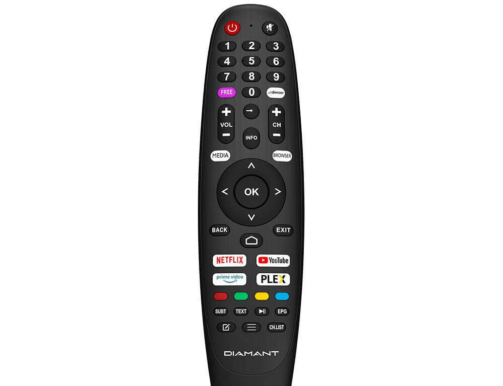 Για ευκολότερη αλληλεπίδραση με τις εφαρμογές από την πλατφόρμα VIDAA της τηλεόρασης DIAMANT, έχετε ειδικά κουμπιά για τις πιο δημοφιλείς εφαρμογές SMART, όπως NETFLIX, Prime Video, YouTube και Plex. Επίσης, τα κουμπιά τοποθετούνται με διαισθητικό τρόπο, με εύκολη και γρήγορη πρόσβαση σε όλες τις παροχές της τηλεόρασης.