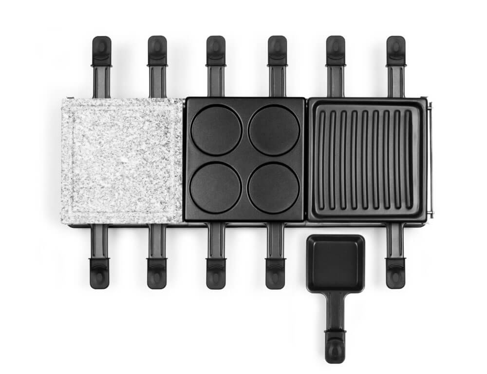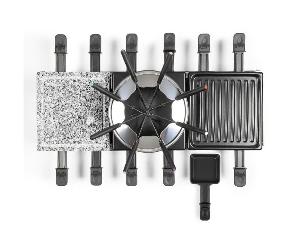 Απολαύστε τα αγαπημένα σας φαγητά χάρη στις 3 αυτόνομες επιφάνειες μαγειρέματος και τη δυνατότητα προετοιμασίας γευμάτων για έως και 12 άτομα. Ψήστε κρεατικά, λαχανικά, ετοιμάστε λαχταριστά φοντύ τυριών ή σοκολάτας με το ειδικό πρόσθετο σκεύος και ζήστε την εμπειρία του Raclette ετοιμάζοντας ορεκτικά, στα μικρά τηγανάκια της συσκευής. Στο πάνω μέρος διαθέτει πλάκα από γρανίτη, η οποία είναι αποσπώμενη αποθηκεύει τη θερμότητα ιδιαίτερα καλά και για μεγάλο χρονικό διάστημα, πράγμα που σημαίνει ότι το φαγητό μαγειρεύεται αργά και είναι τρυφερό και ζουμερό!