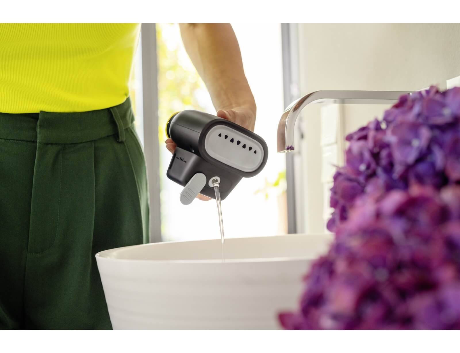 Ανάλογα με τον ατμοκαθαριστή Kärcher που χρησιμοποιείται, διατίθεται έως και 1,5 λίτρο νερού. Το δοχείο συλλογής που είναι ενσωματωμένο στο εξάρτημα για φρεσκάρισμα ενδυμάτων συλλέγει περίπου 100 ml νερού συμπύκνωσης. Αυτό είναι αρκετό για περίπου πέντε ή έξι ρούχα. Το δοχείο μπορεί να αδειάσει ανά πάσα στιγμή.