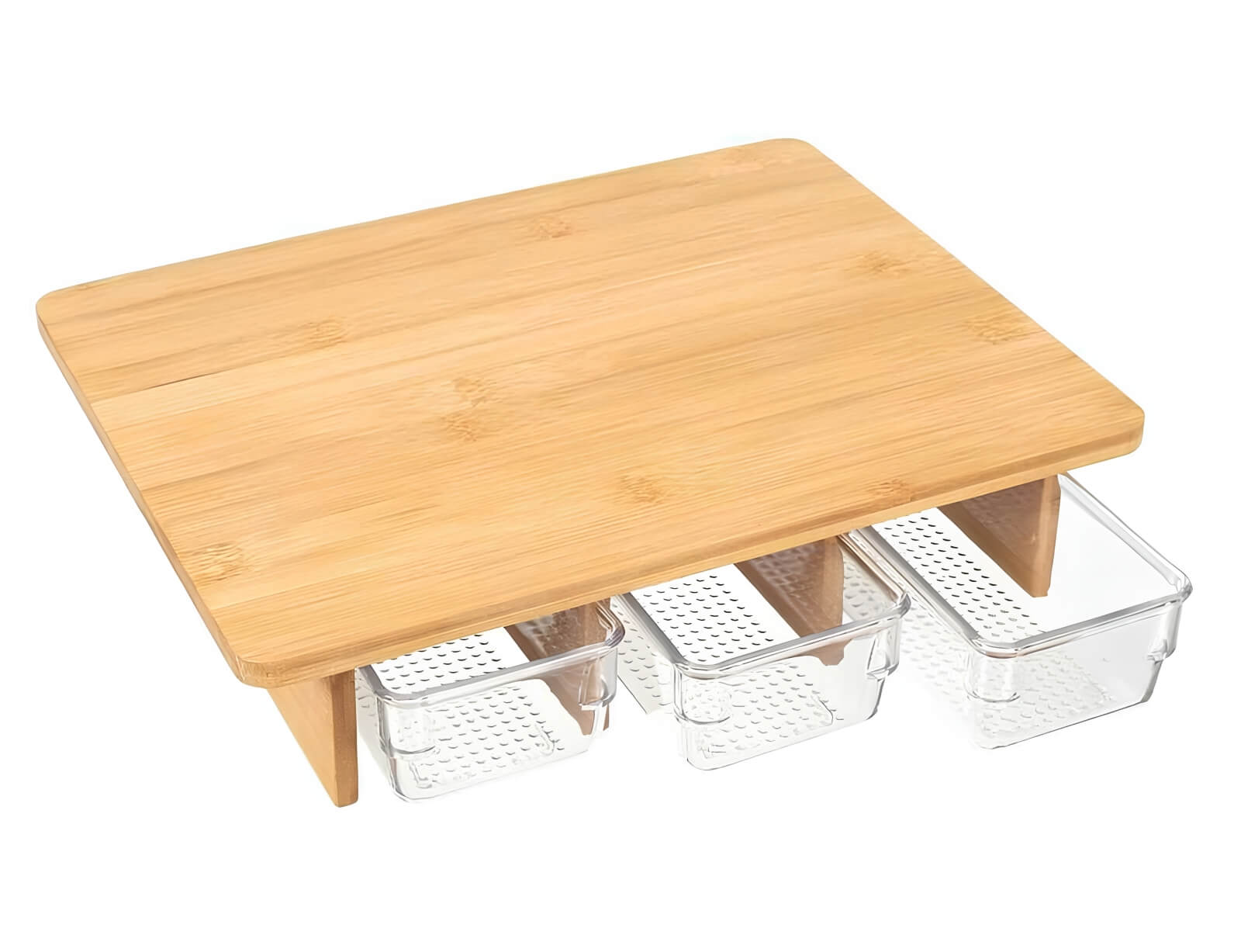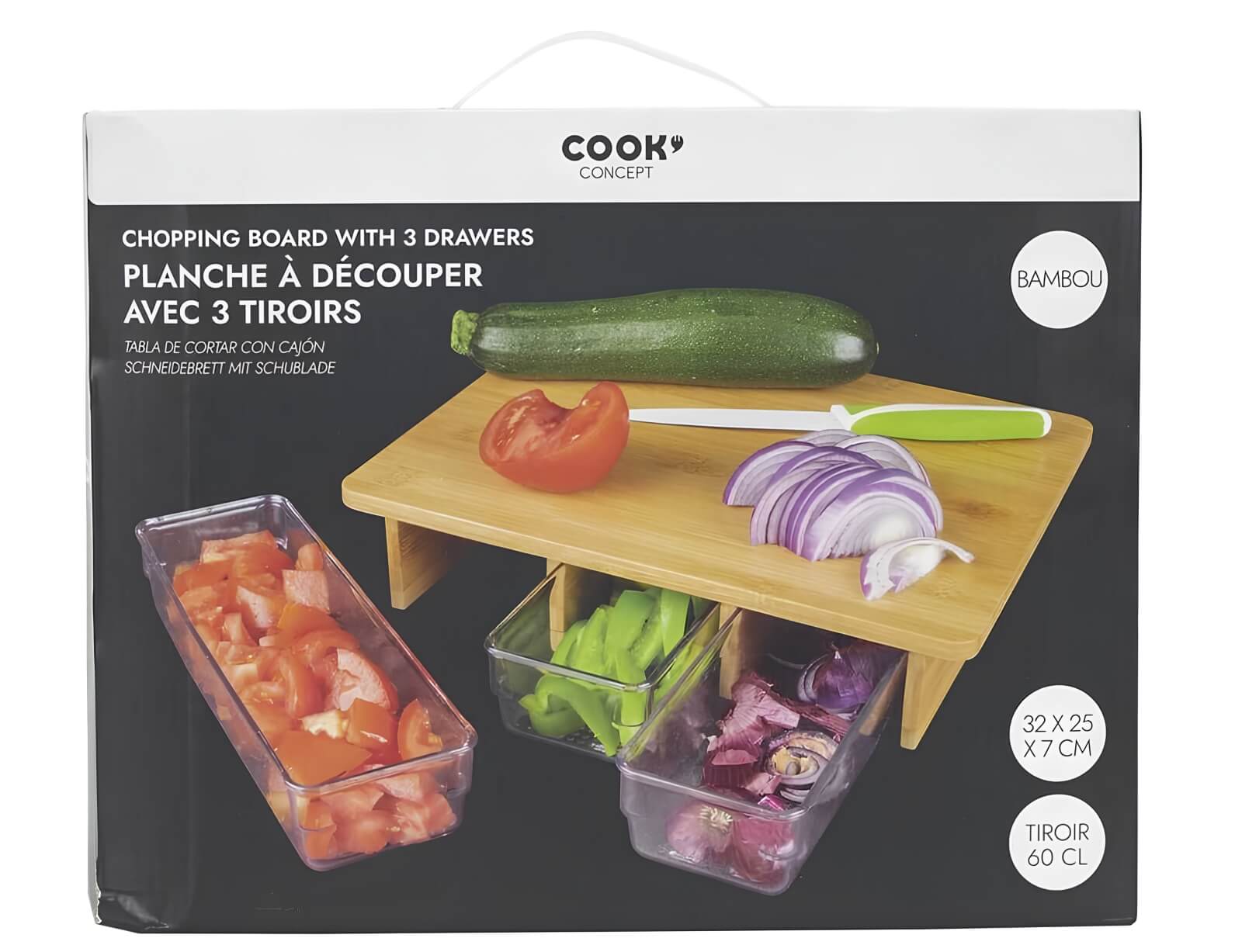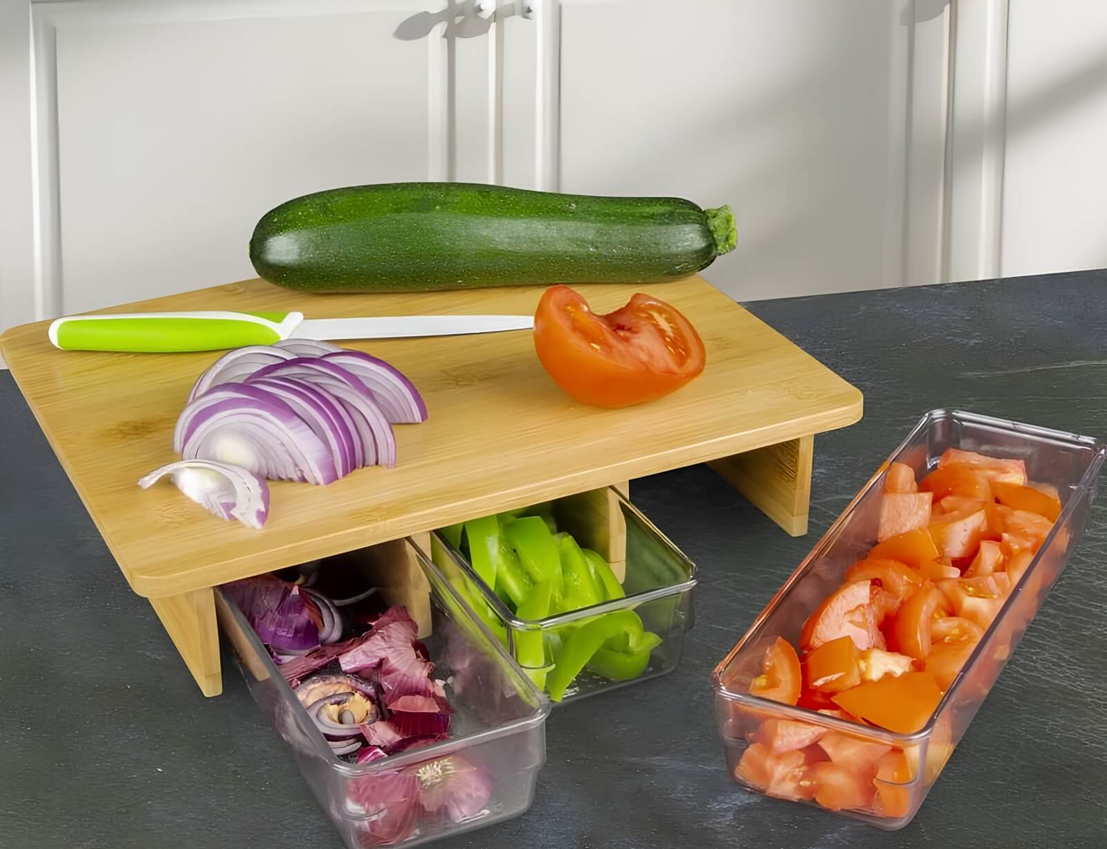 Κόψτε και αποθηκεύστε εύκολα με αυτήν την επιφάνεια κοπής, η οποία διαθέτει 3 ξεχωριστά συρτάρια για καλύτερη οργάνωση και ευκολία στην προετοιμασία των γευμάτων σας! Επωφεληθείτε από τον προσαρμοσμένο και έξυπνο σχεδιασμό που επιτρέπει όχι μόνο την κοπή των υλικών αλλά και την άμεση αποθήκευσή τους σε ειδικά συρτάρια. Με ιδανικό μέγεθος για όλες τις κουζίνες, προσφέροντας αρκετό χώρο για την κοπή και την αποθήκευση των συστατικών χωρίς να καταλαμβάνει υπερβολικό χώρο στον πάγκο, όλα τα συρτάρια μαζί έχουν χωρητικότητα 600ml, οπότε μπορείτε να οργανώσετε υλικά, όπως λαχανικά, φρούτα, ή ακόμα και διαφορετικά είδη κρέατος ή ψαριών, με απόλυτη ευχέρεια.