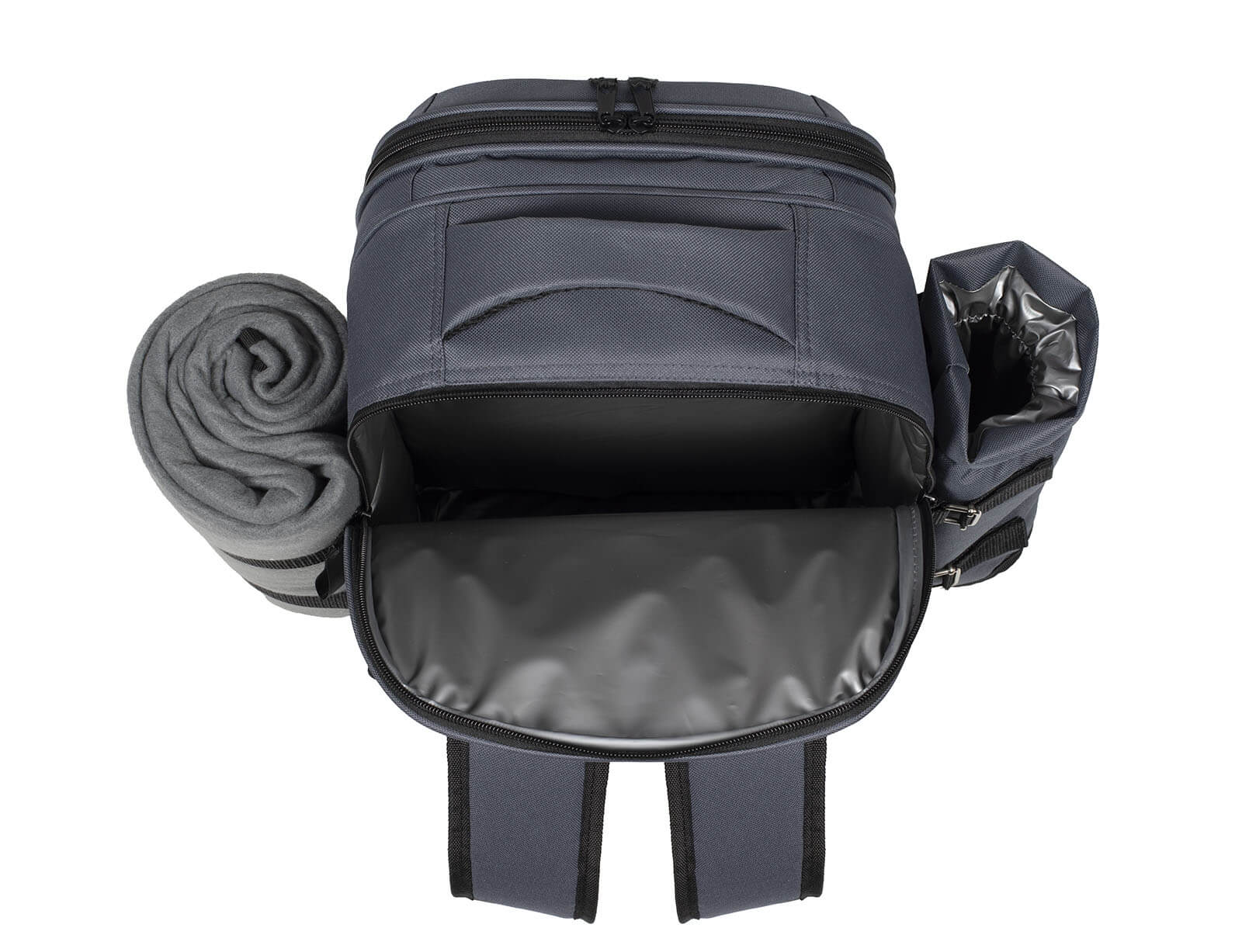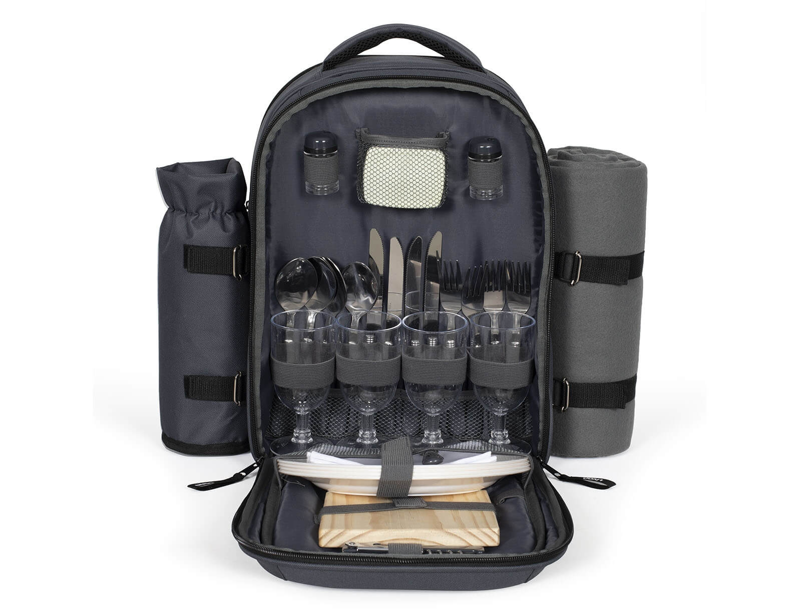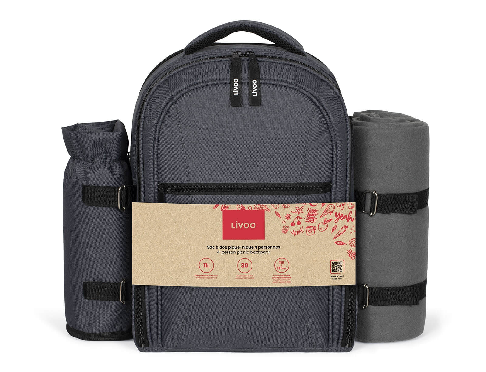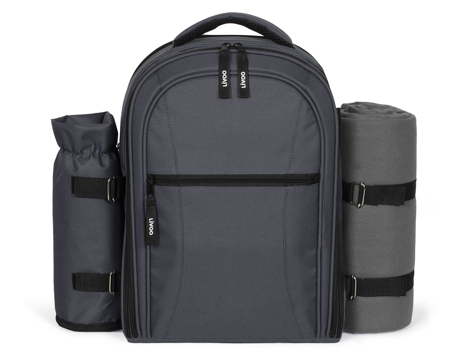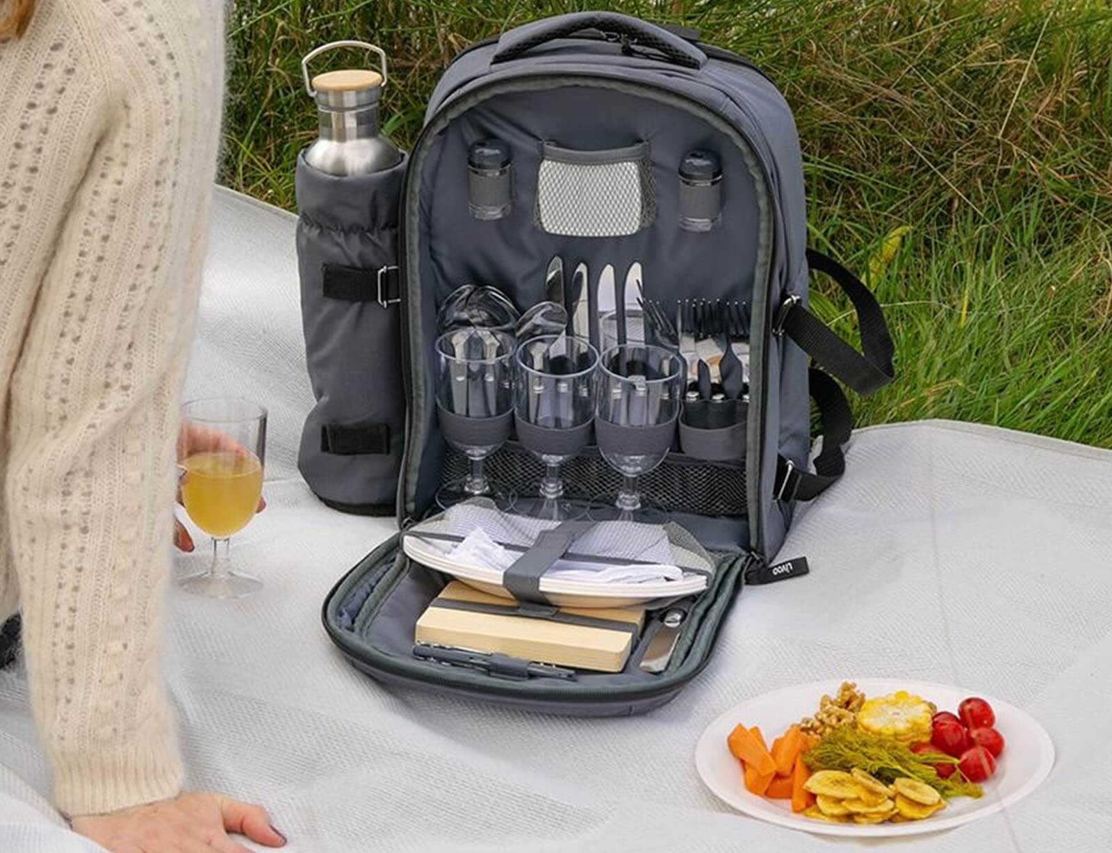 Το ιδανικότερο και πρακτικότερο σακίδιο για να απολαύσετε το πικνικ στις εκδρομές με την παρέα σας. Το σακίδιο της εταιρείας Livoo διαθέτει πλήρη εξοπλισμό για πικνικ για 4 άτομα. Διαθέτει σετ με μαχαιροπίρουνα, ποτήρια, πιάτα, ξύλινη επιφάνεια κοπής, τιρμπουσόν, κουτί για βούτυρο και υφασμάτινες χαρτοπετσέτες. Το μονωμένο διαμέρισμα και η θήκη για μπουκάλια σας επιτρέπουν να κάνετε πεζοπορία με απόλυτη ηρεμία χωρίς τον κίνδυνο διαρροής των υγρών που μεταφέρονται. Επίσης, διαθέτει μια κουβέρτα fleece, της οποίας η μια πλευρά είναι αδιάβροχη.