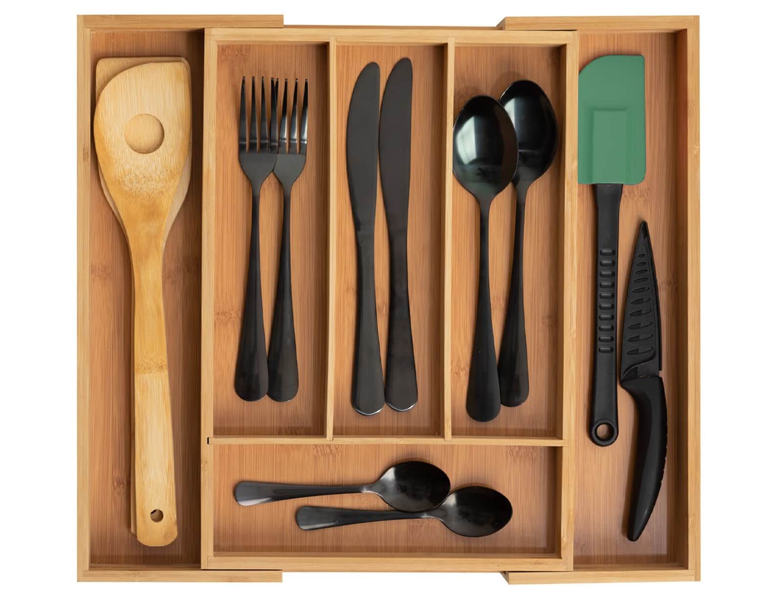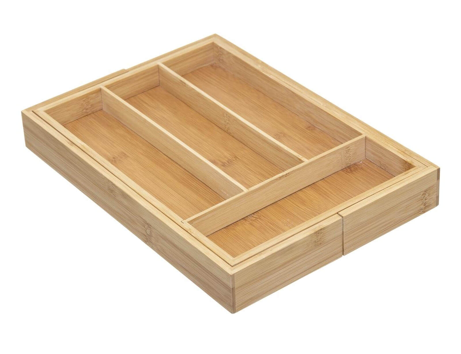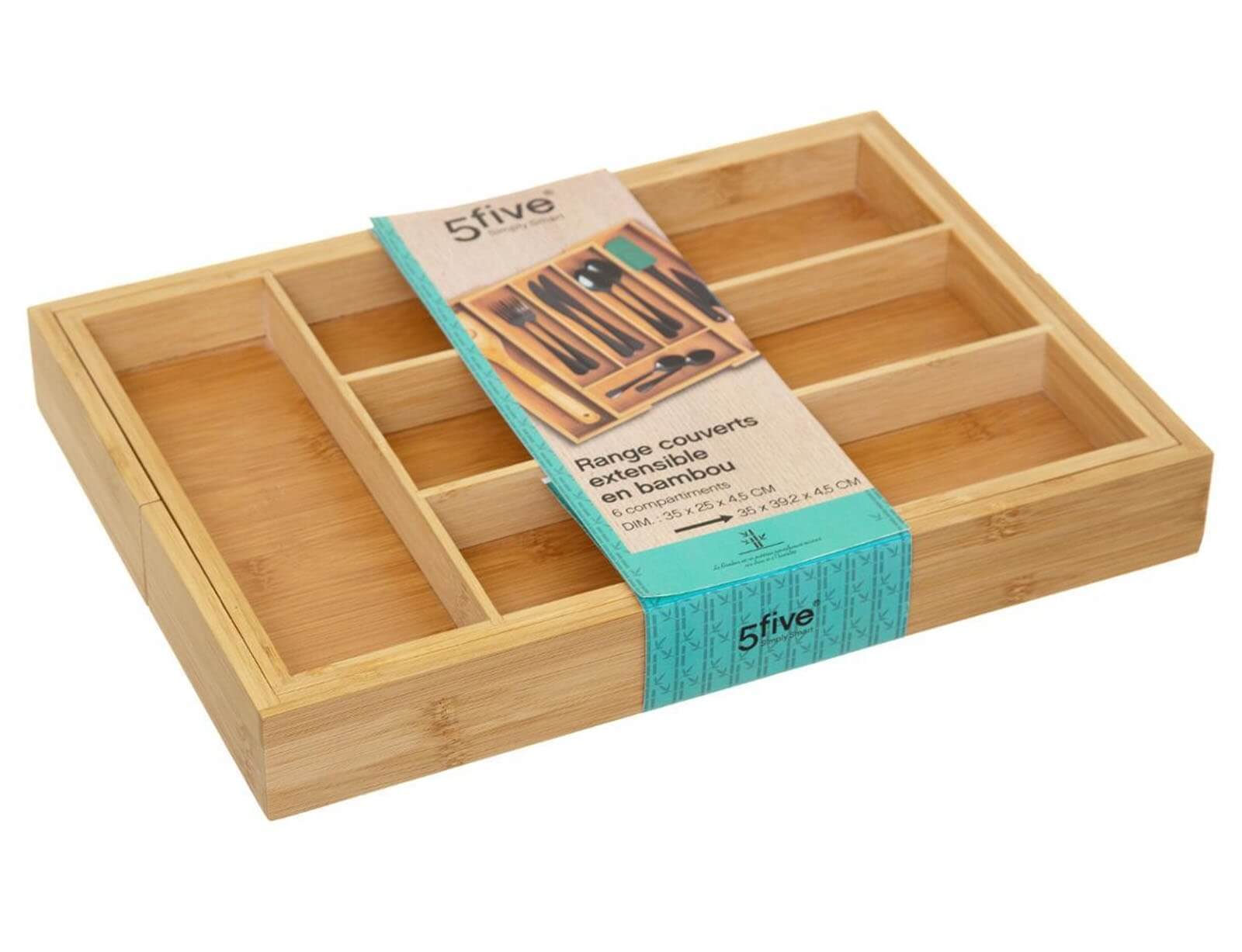 Θήκη για μαχαιροπίρουνα της εταιρείας 5five κατάλληλη για τοποθέτηση στο συρτάρι της κουζίνας σας. Θα σας βοηθήσει να έχετε τακτοποιημένα τα μαχιροπίρουνα σας σε όποια διάταξη επιθυμείτε, ώστε να έχετε εύκολη και άμεση πρόσβαση σε αυτά όποτε τα χρειάζεστε. Είναι κατασκευασμένη από ξύλο το οποίο είναι εύκολο στη συντήρηση, αλλά παράλληλα και ανθεκτικό στις φθορές και τον χρόνο. Mε το μηχανισμό επέκτασης θα μπορείτε να τη ρυθμίσετε ανάλογα με τις ανάγκες και τους χώρους σας.