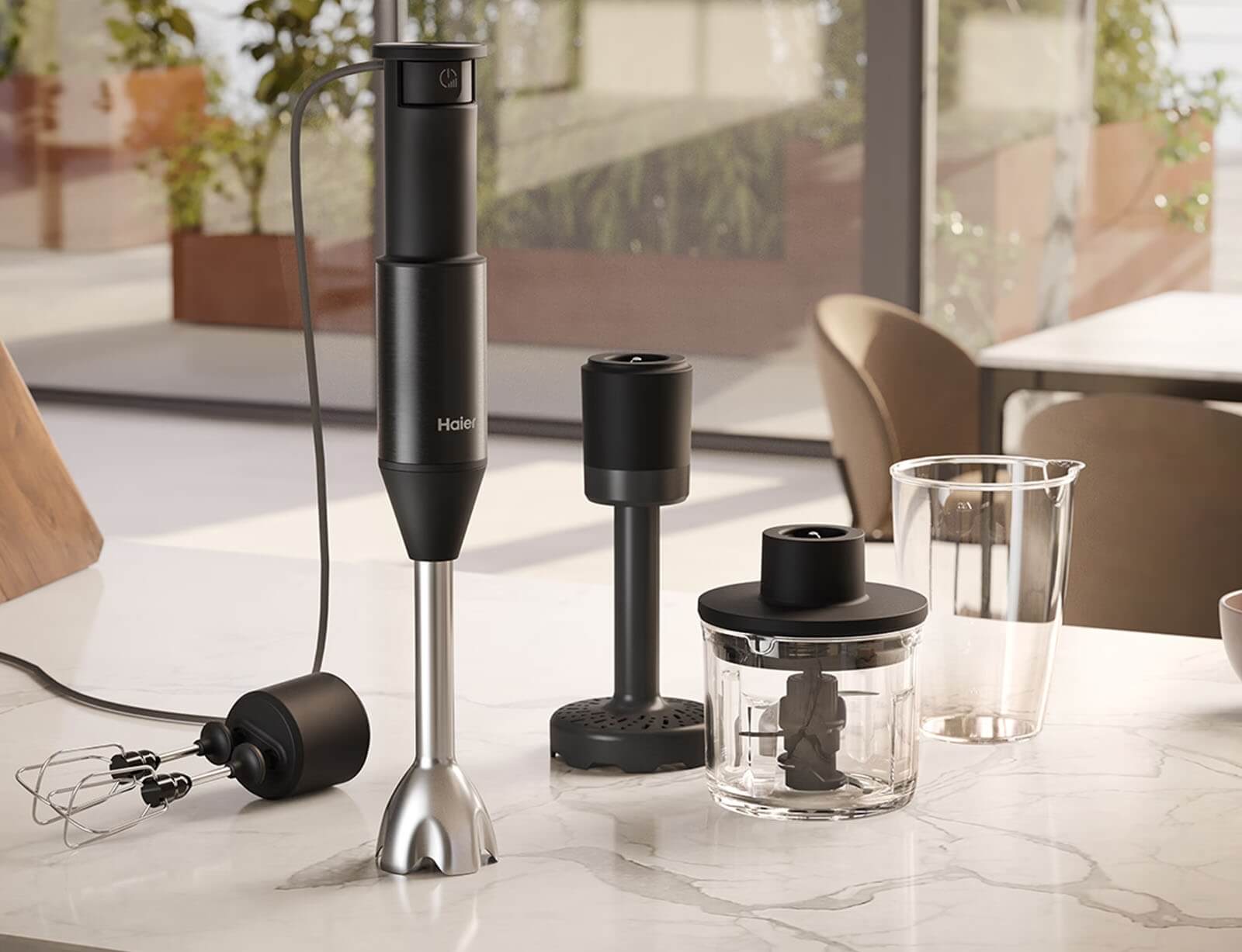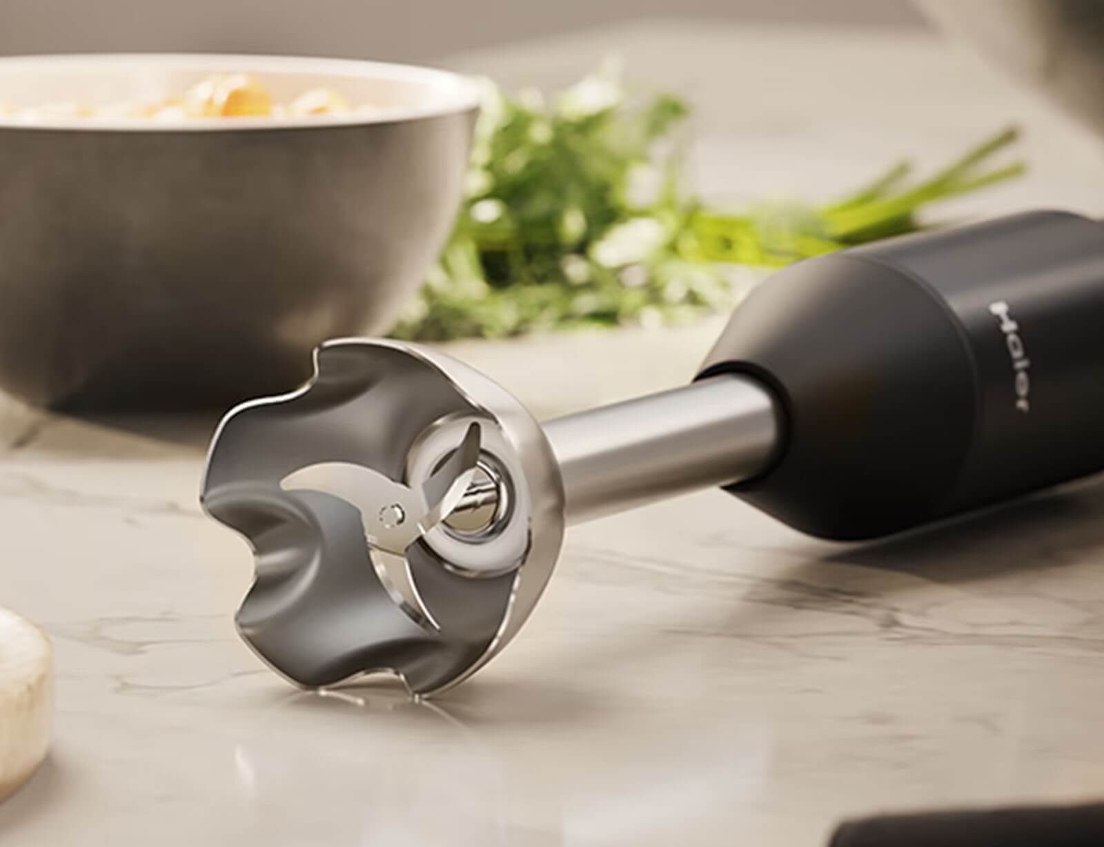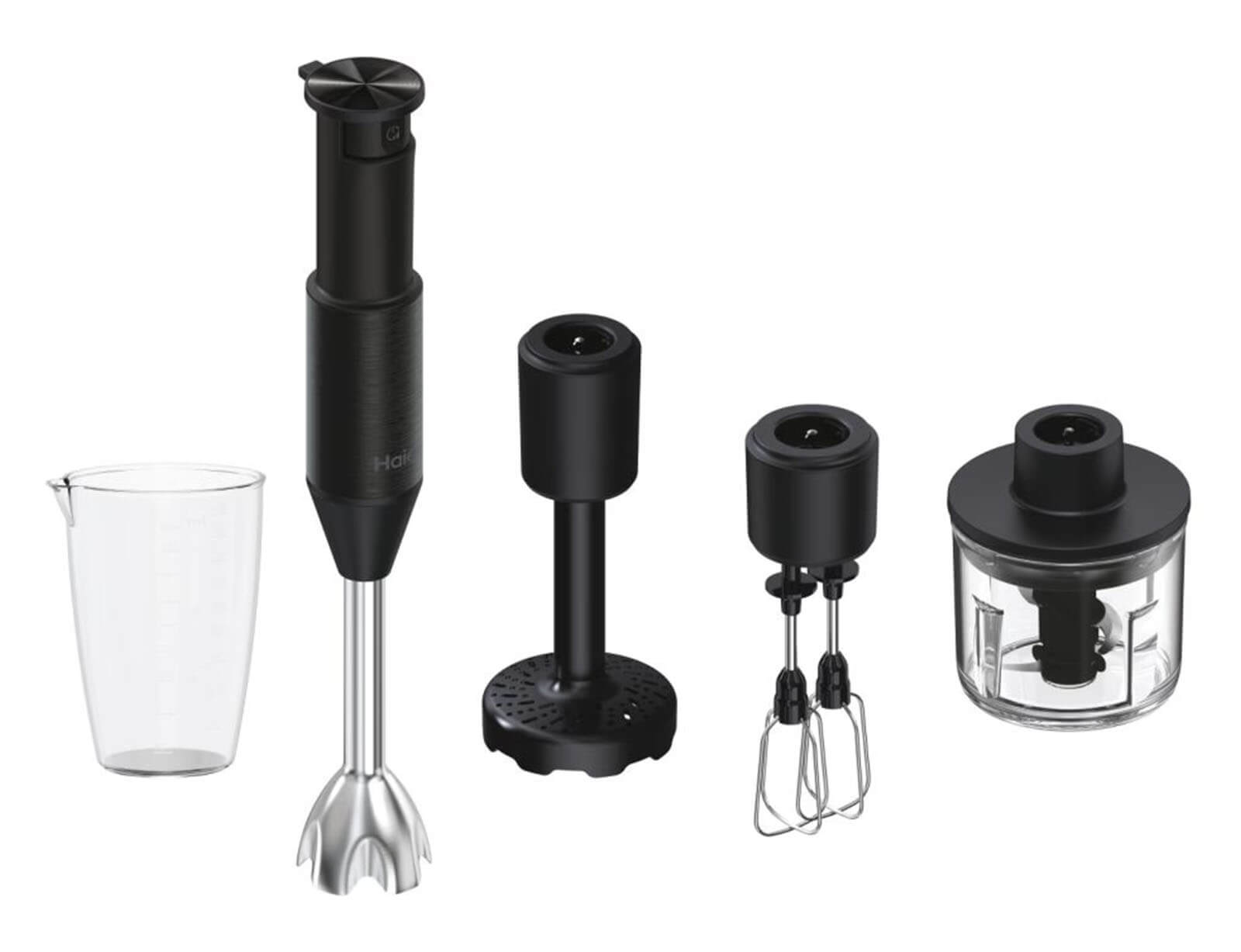 Με το νέο Hand Blender της σειράς i-Master της Haier, μπορείτε να εκτελέστε πολλές εργασίες για την προετοιμασία των φαγητών με μια μόνο συσκευή, γρήγορα και εύκολα! Μπορεί να λειτουργήσει σαν 4 συσκευές σε 1 για: την κοπή υλικών στο ειδικό γυάλινο δοχείο, για την κοπή υλικών μέσα στο φαγητό με την μεταλλική ράβδο, για την πολτοποίηση μαλακών υλικών με την ειδική κεφαλή πολτοποίησης ή και για την ανάμιξη υλικών με την προσθήκη του ειδικού εργαλείου με τους αναδευτήρες.