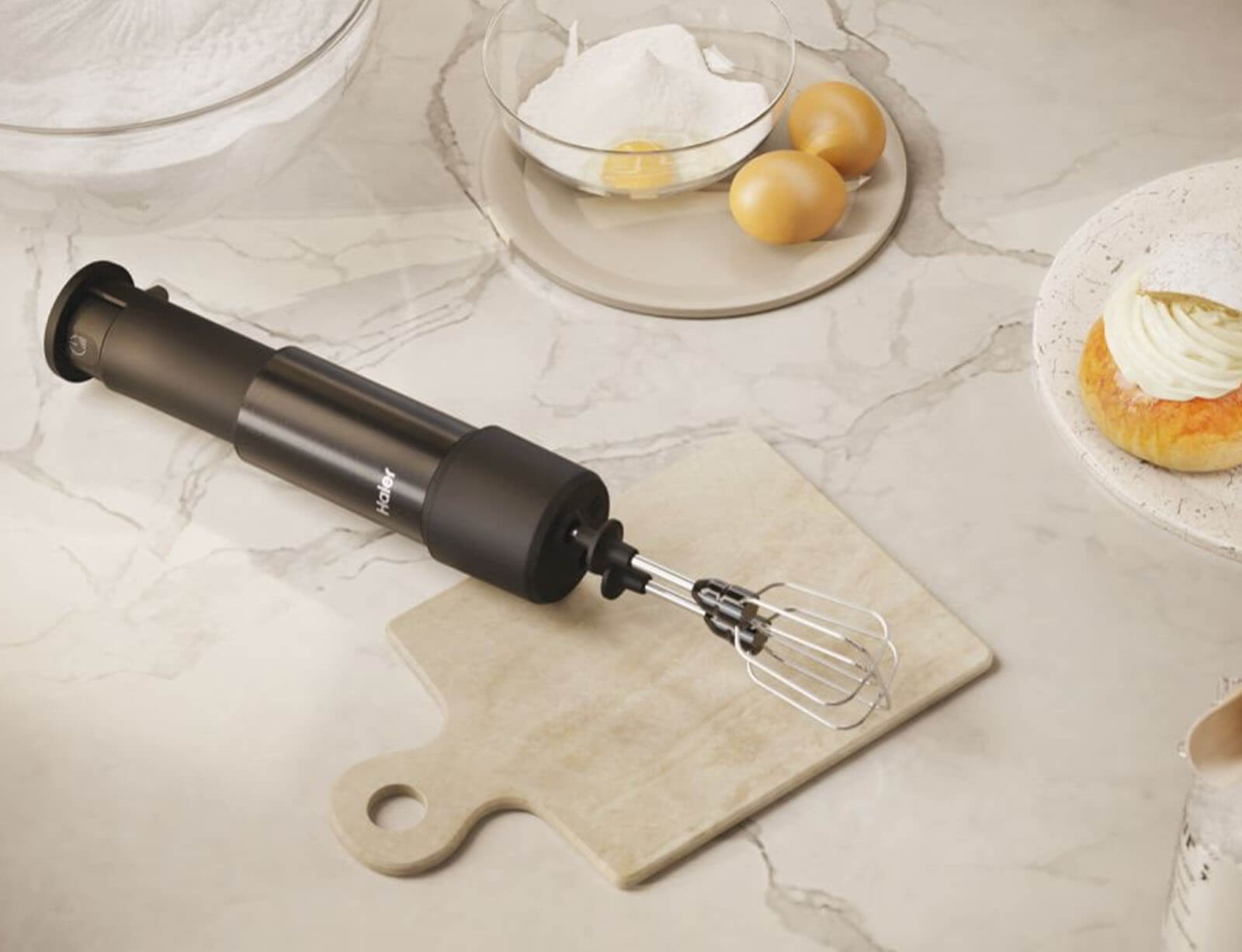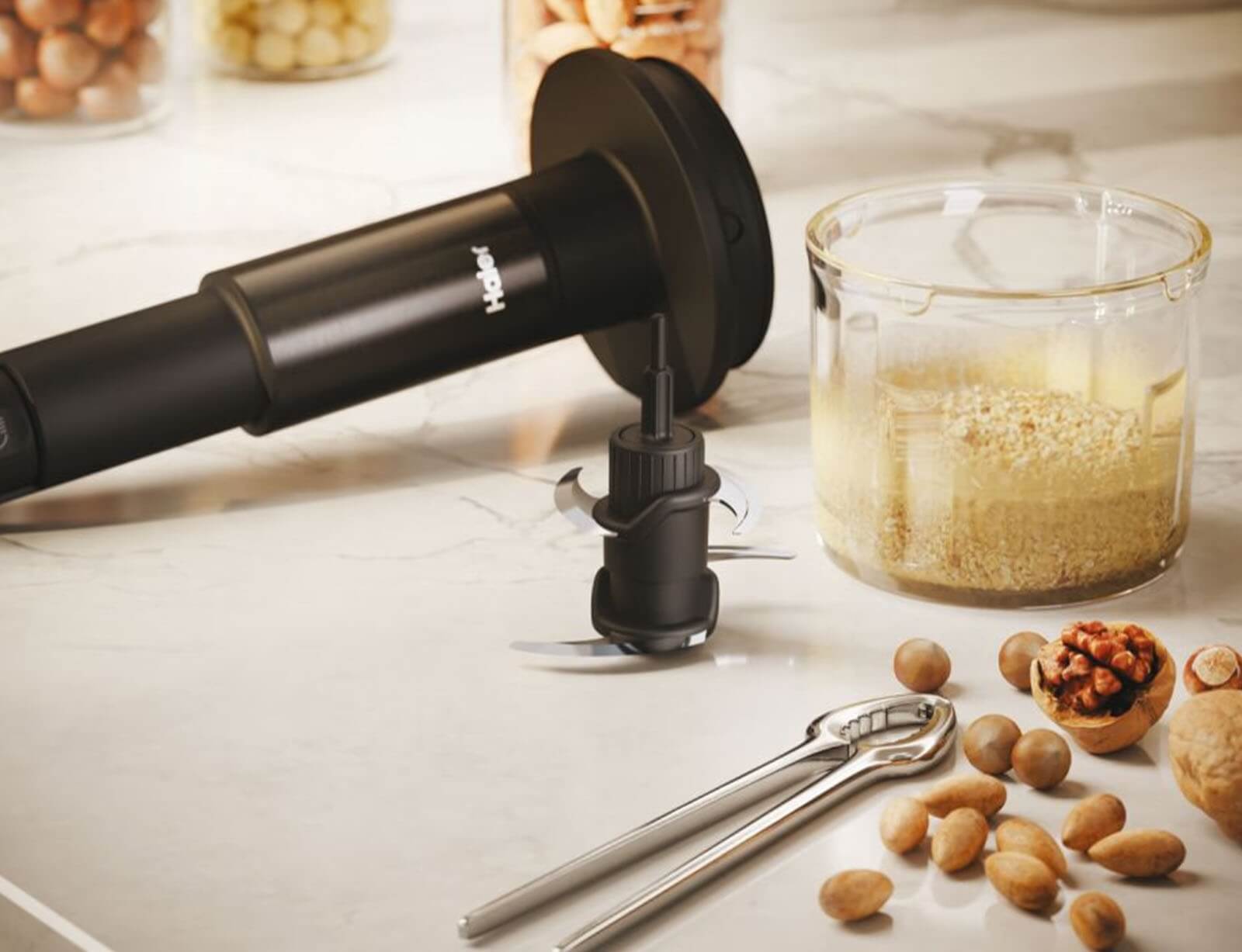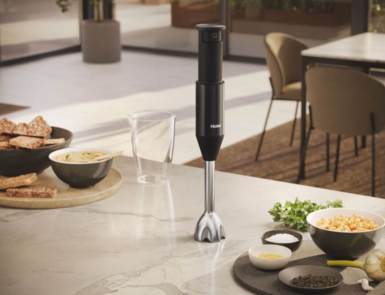 Με το νέο Hand Blender της σειράς i-Master της Haier, μπορείτε να εκτελέστε πολλές εργασίες για την προετοιμασία των φαγητών με μια μόνο συσκευή, γρήγορα και εύκολα! Μπορεί να λειτουργήσει σαν 4 συσκευές σε 1 για: την κοπή υλικών στο ειδικό γυάλινο δοχείο, για την κοπή υλικών μέσα στο φαγητό με την μεταλλική ράβδο, για την πολτοποίηση μαλακών υλικών με την ειδική κεφαλή πολτοποίησης ή και για την ανάμιξη υλικών με την προσθήκη του ειδικού εργαλείου με τους αναδευτήρες.