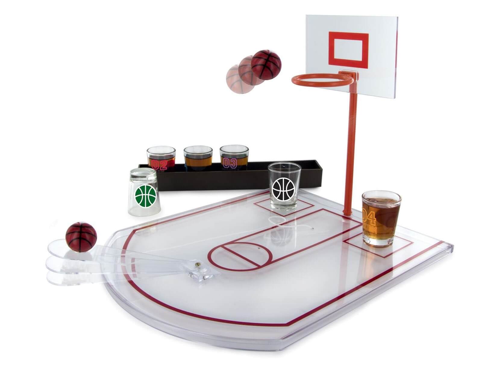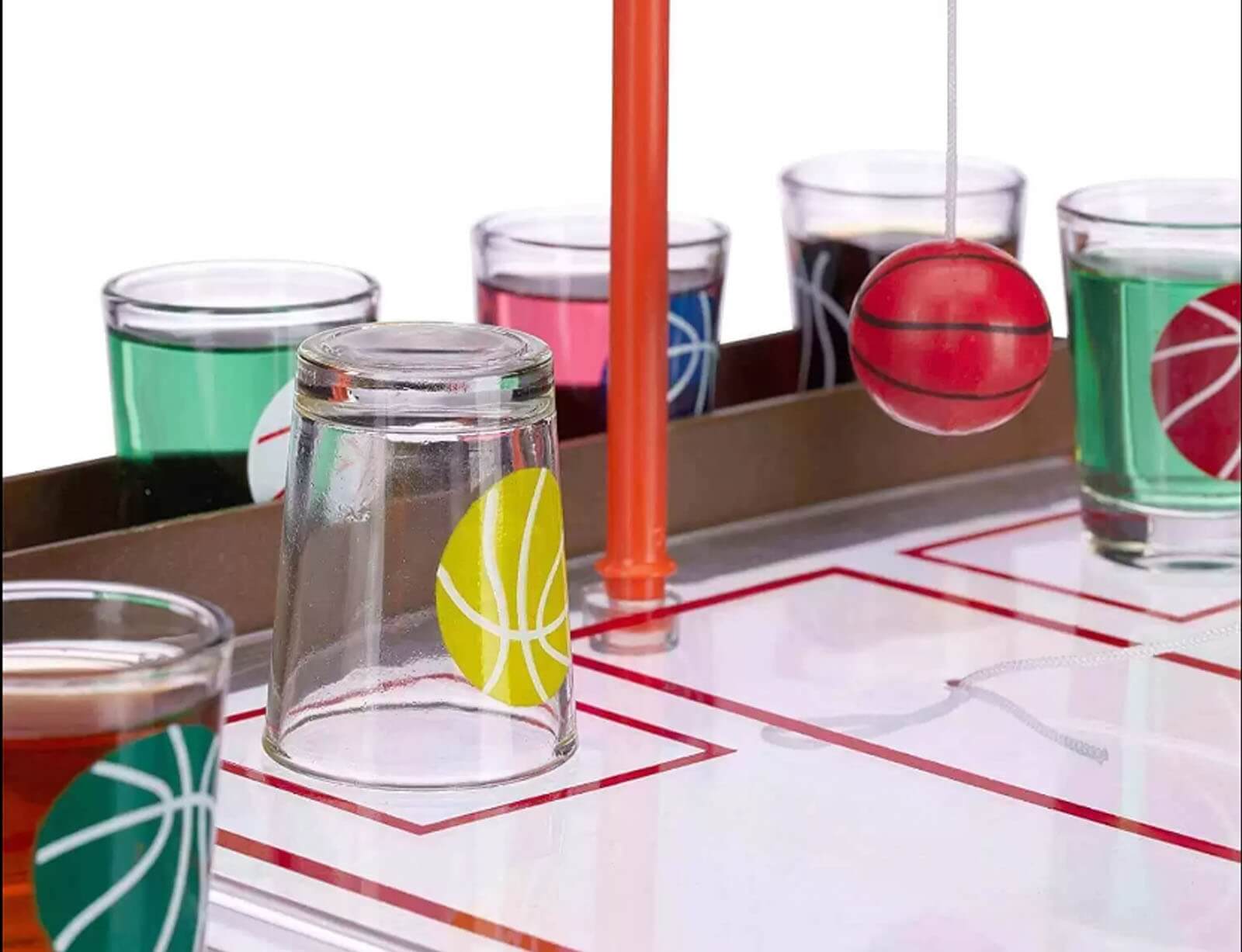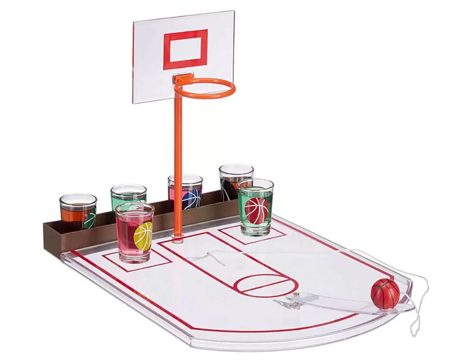 Ανακαλύψτε το νέο μας επιτραπέζιο παιχνίδι μπάσκετ με σφηνοπότηρα! Ετοιμαστείτε για μια μοναδική εμπειρία γεμάτη γέλιο, ανταγωνισμό και τα αγαπημένα σας ποτά. Ρίξτε τη μπάλα και προσπαθήστε να πετύχετε καλάθι! Κάθε φορά που δεν τα καταφέρνετε, είναι η ώρα να πιείτε ένα σφηνάκι! Χάρη στο πρακτικό κορδόνι με το οποίο στερεώνεται η μπάλα στον αγωνιστικό χώρο, δεν θα χρειάζεται να ανησυχείτε μήπως τη χάσετε όταν πιείτε λίγο παραπάνω.