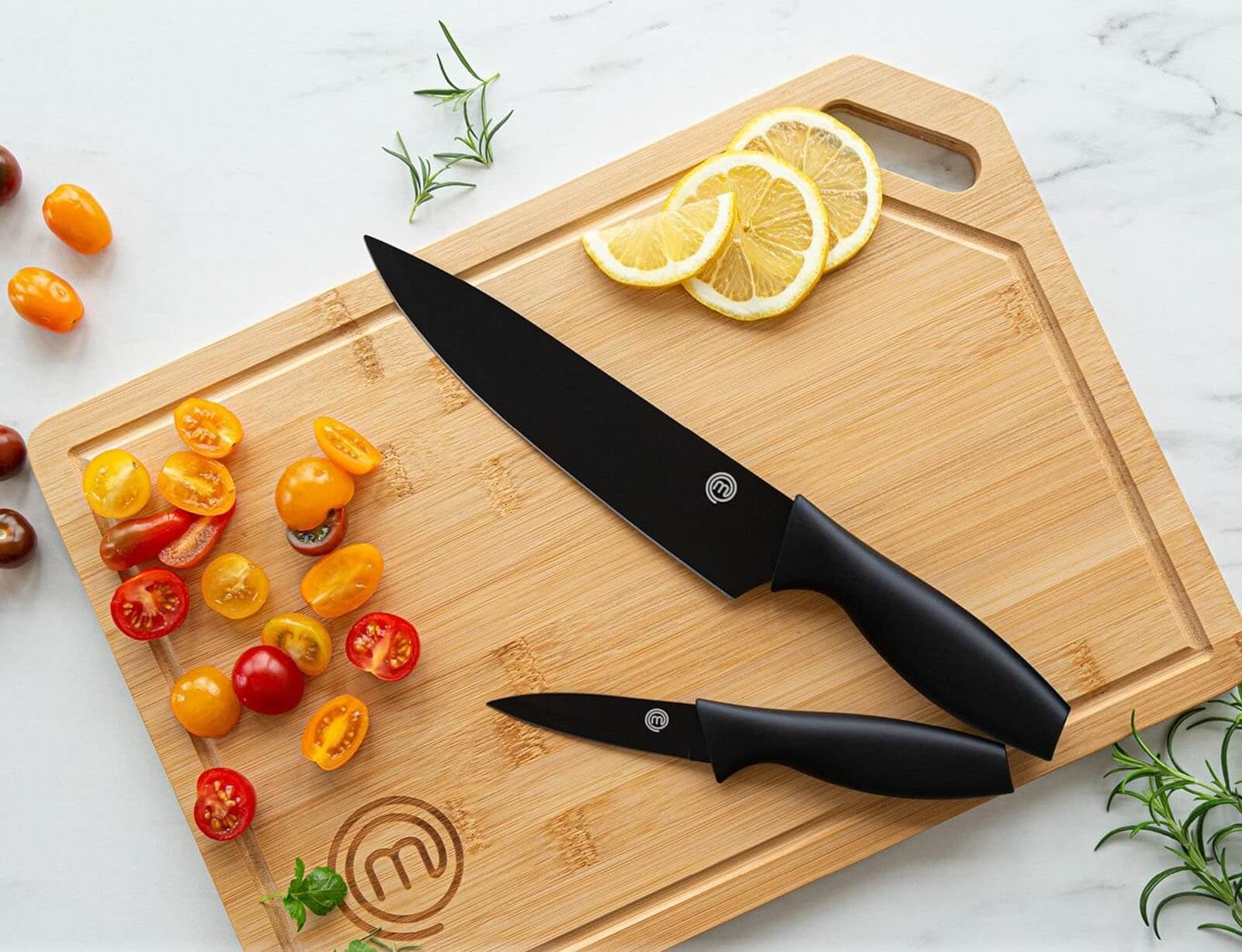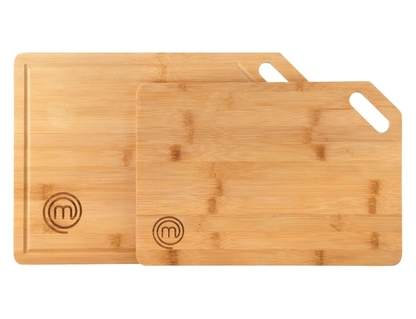 Αυτό το επαγγελματικής ποιότητας σετ επιφανειών μπαμπού 2 τεμαχίων είναι επίσημο προϊόν της τηλεοπτικής σειράς MasterChef.