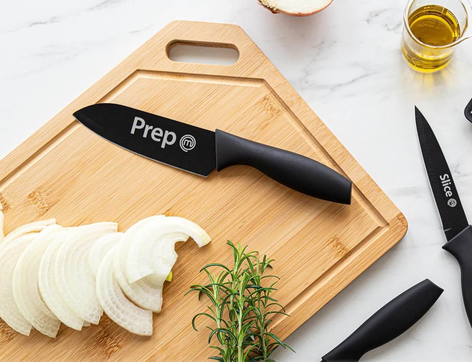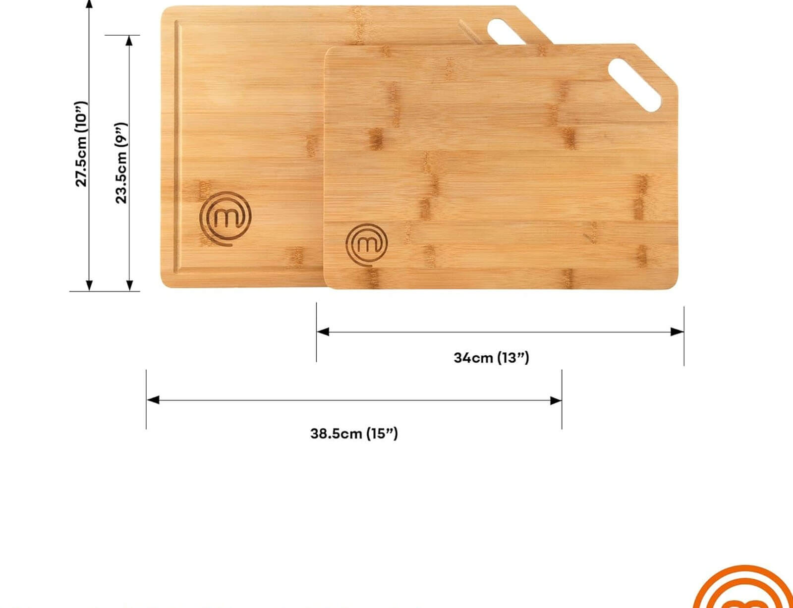 Προετοιμάστε με ευκολία όταν εκμεταλλευτείτε αυτό το σετ δύο σανίδων κοπής από μπαμπού! Ιδανικό για κόψιμο και κοπή σε κύβους, το σετ περιλαμβάνει μία μεγάλη και μία μεσαία σανίδα με λογότυπο Masterchef. Εγκεκριμένο από το MasterChef και σίγουρα θα κάνει την προετοιμασία του γεύματος χωρίς προβλήματα!