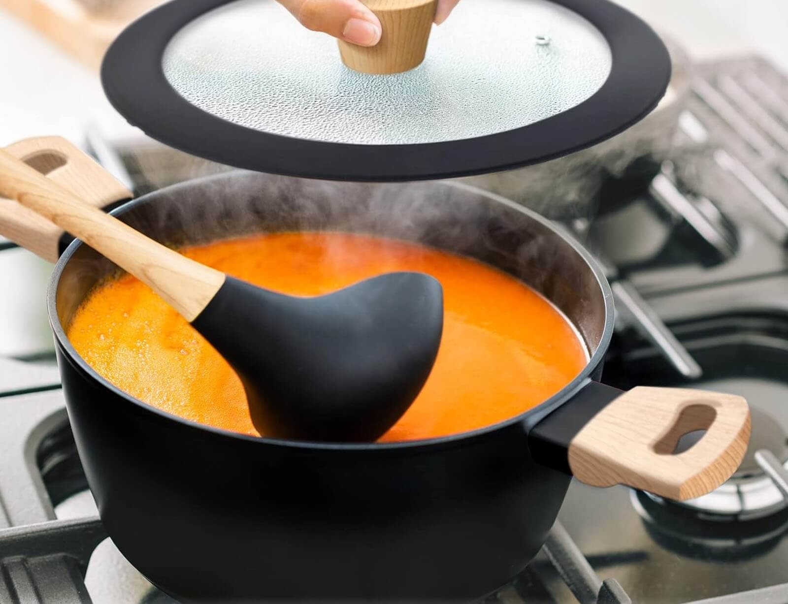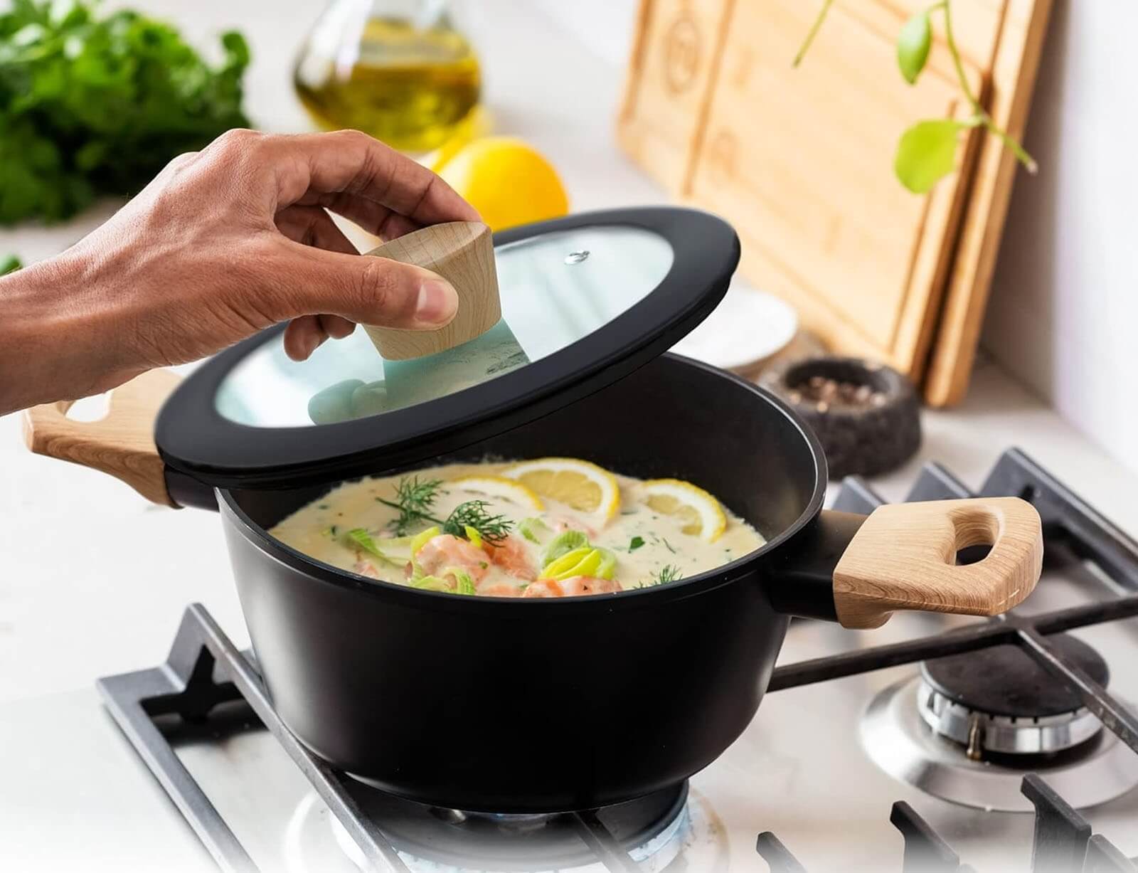 Οι εργονομικές λαβές με προστασία από τη φλόγα soft-touch σε αυτή την κατσαρόλα και το καπάκι έχουν κομψή ξύλινη εμφάνιση, παρέχουν ασφαλές κράτημα και δεν ζεσταίνονται ποτέ πολύ.