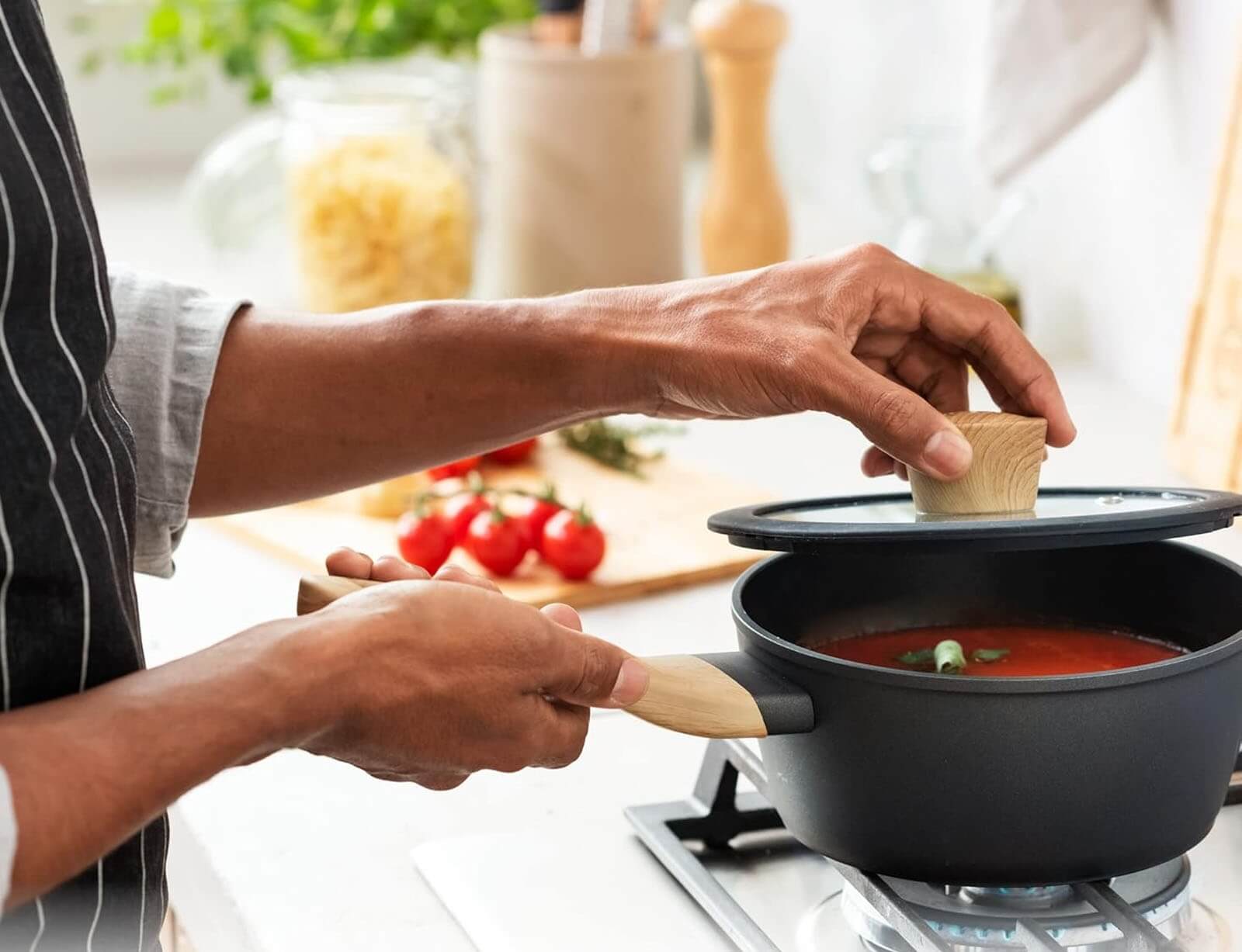 Οι εργονομικές λαβές με προστασία από τη φλόγα soft-touch σε αυτή την κατσαρόλα και το καπάκι έχουν κομψή ξύλινη εμφάνιση, παρέχουν ασφαλές κράτημα και δεν ζεσταίνονται ποτέ πολύ.