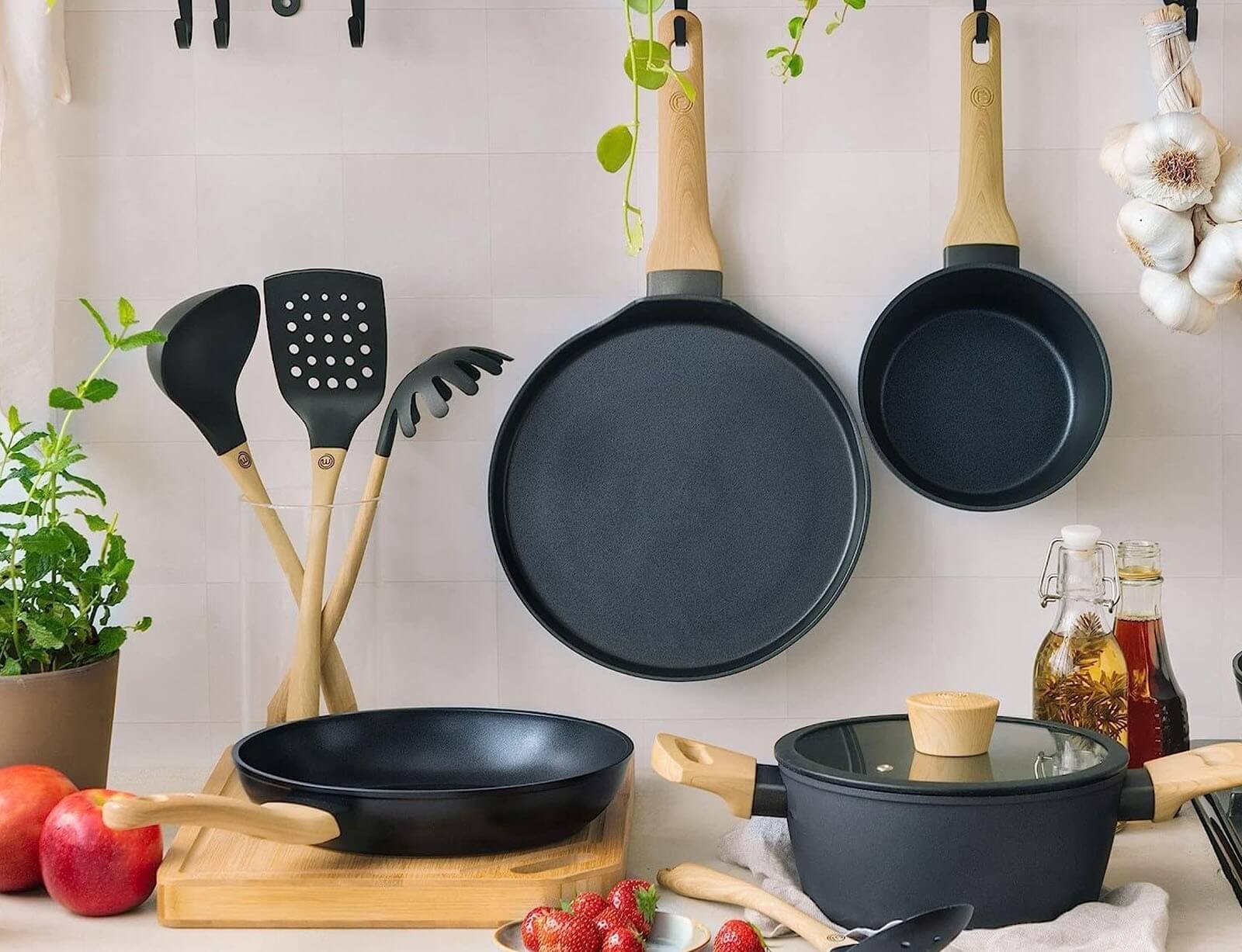 Premium μαγειρικά σκεύη κατασκευασμένα με υψηλής ποιότητας αντικολλητική, μη τοξική επίστρωση ILAG κατασκευασμένη χωρίς PFOA.