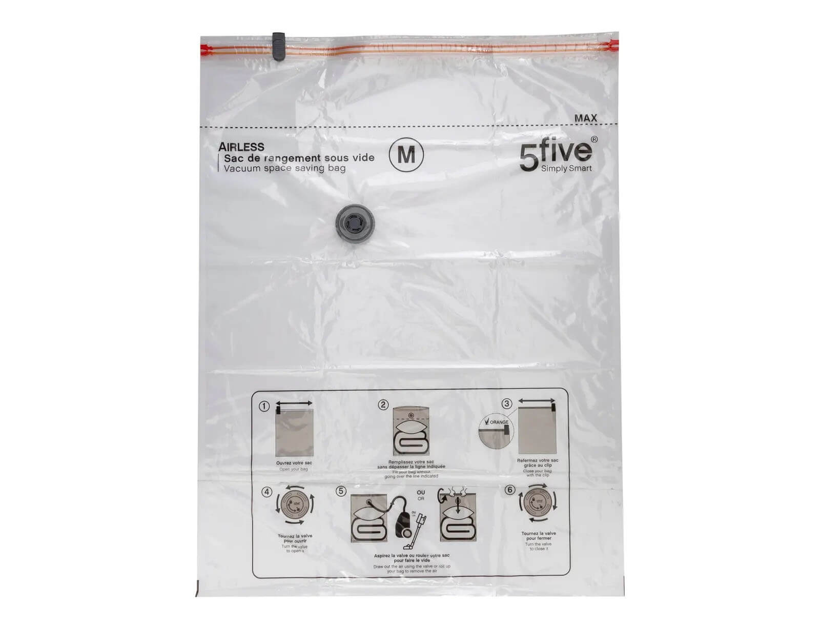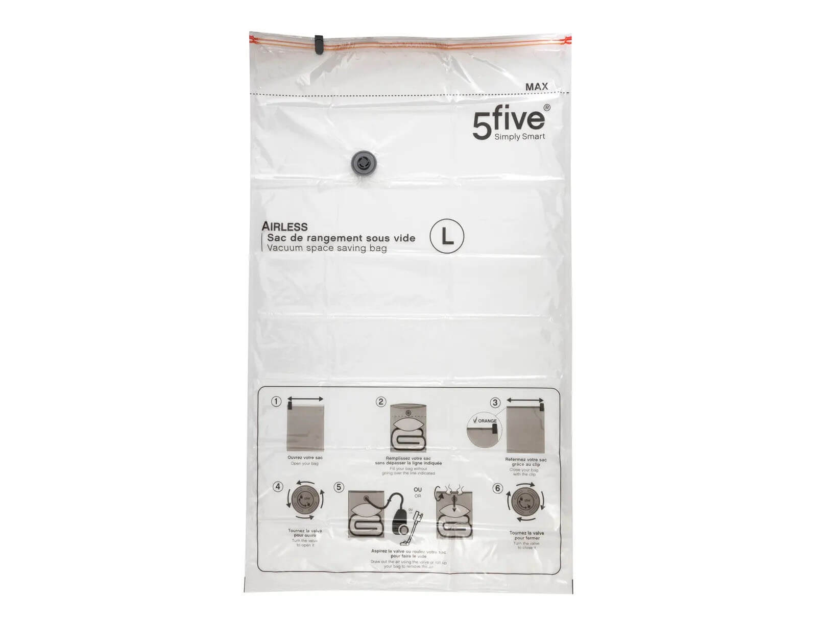 Τακτοποιήστε και οργανώστε το σπίτι σας με τη σακούλα αποθήκευσης κενού αέρος από τη 5five. Η σακούλα συρρίκνωσης κενού αέρος θα μειώσει τον όγκο των ρούχων που θέλετε να αποθηκεύσετε και θα σας προσφέρει όχι μόνο εξοικονόμηση χώρου αλλά και απόλυτη προστασία των ρούχων σας. Είναι αεροστεγής, προστατεύει από σκόνη, υγρασία, μυρωδιές, ακάρεα και σκόρο. Ανοίξτε το καπάκι της βαλβίδας, ενεργοποιήστε την ηλεκτρική σκούπα για να απορροφήσει όλο τον αέρα.
