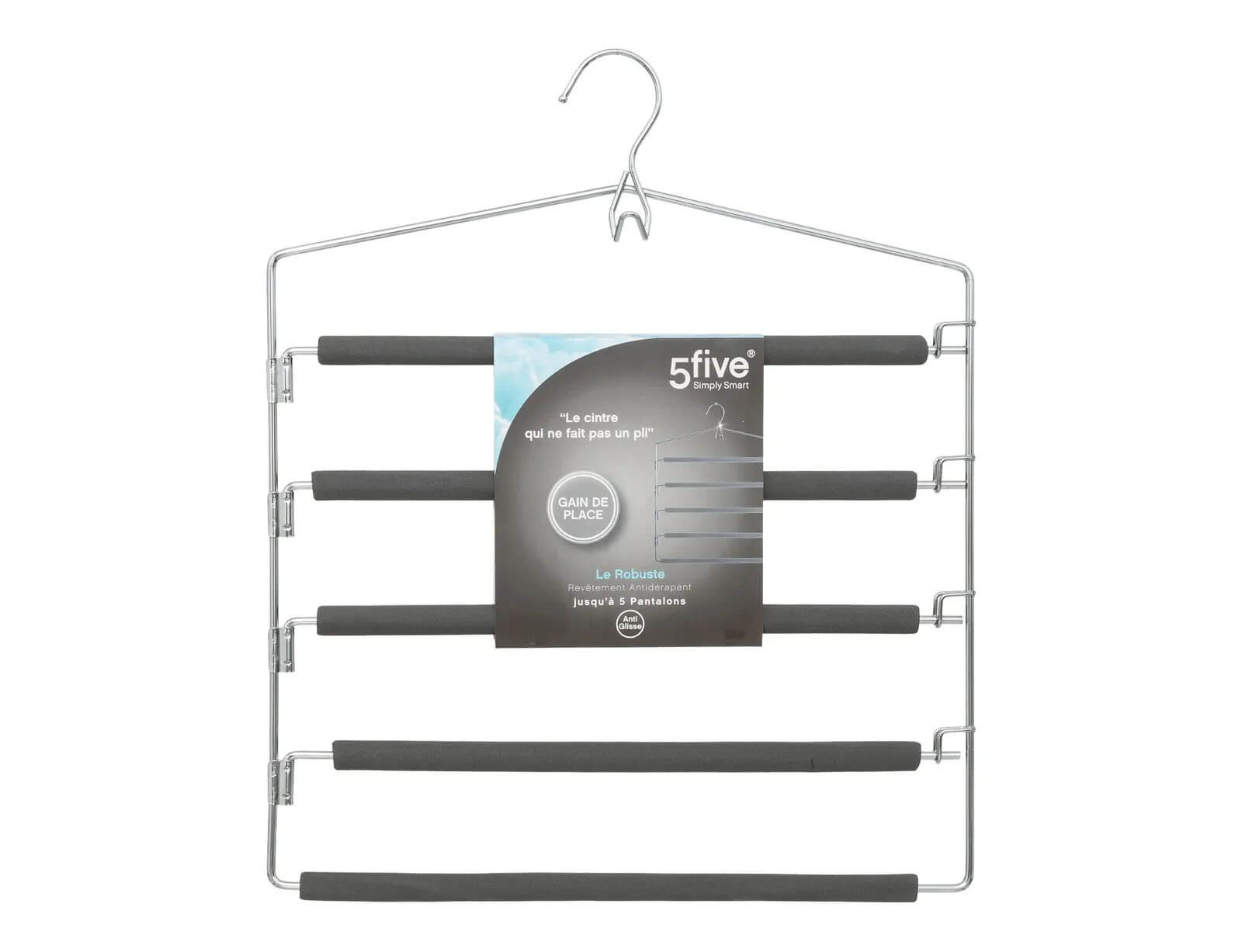 Οργανώστε και ανανεώστε τη ντουλάπα σας με την κρεμάστρα από τη 5five. Χάρη στον μεταλλικό, λεπτό σχεδιασμό μπορείτε να εξοικονομήσετε χώρο στη ντουλάπα σας, ενώ με την αφρώδη επένδυση δεν θα γλιστράνε τα ρούχα. Μπορείτε να κρεμάσετε μέχρι και 5 παντελόνια, σορτσάκια κτλ.