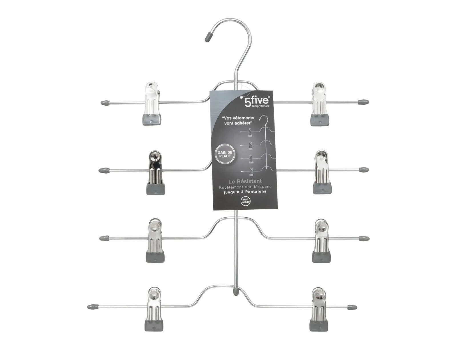 Οργανώστε και ανανεώστε τη ντουλάπα σας με την κρεμάστρα 4 θέσεων από τη 5five. Κάθε θέση διαθέτει στις άκρες προστατευτικά “stop” για να διασφαλίσουν ότι τα κλιπ σας δεν θα φύγουν από τη ράβδο. Τα ειδικά κλιπ διασφαλίζουν ότι τα ρούχα σας δεν θα πέσουν ποτέ, ενώ ταυτόχρονα τα κρατούν σε άψογη κατάσταση χωρίς να τα τσαλακώνουν!