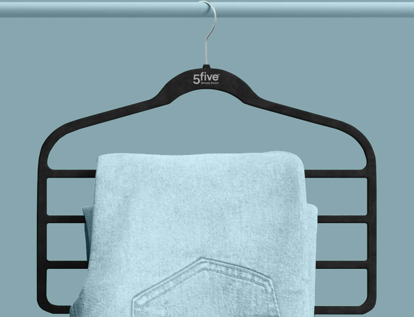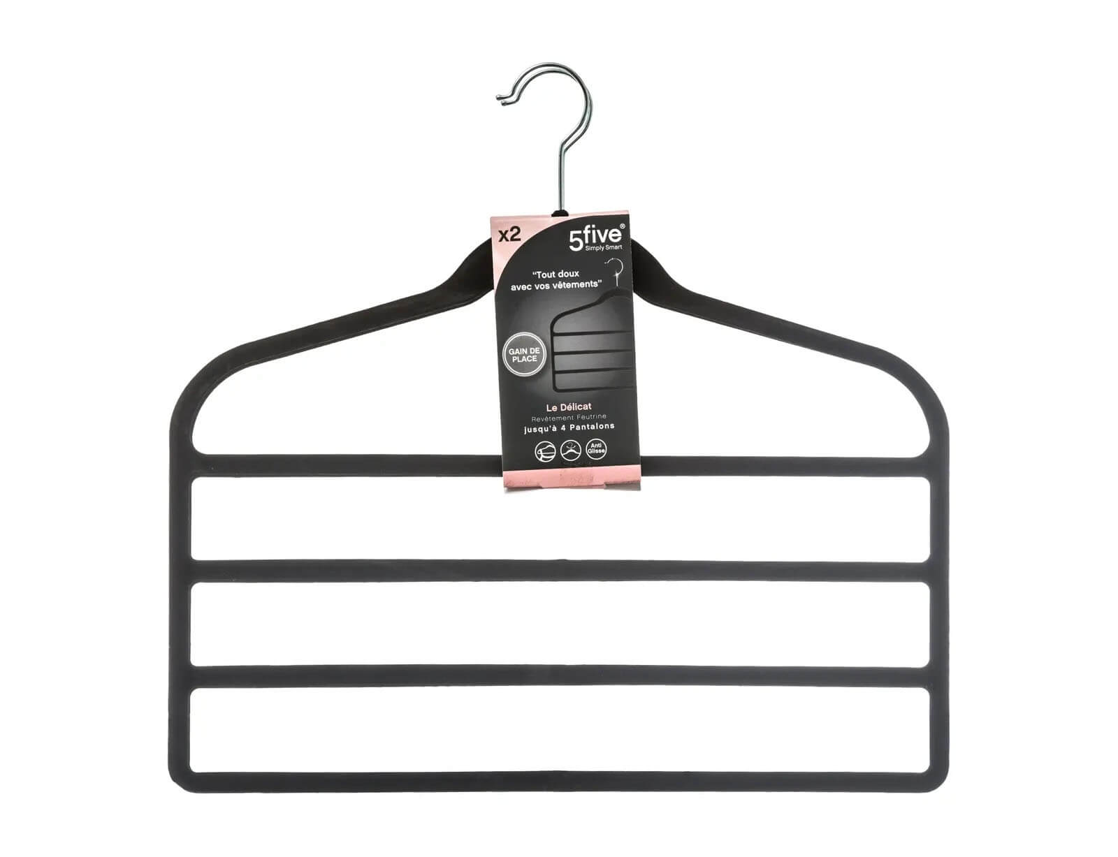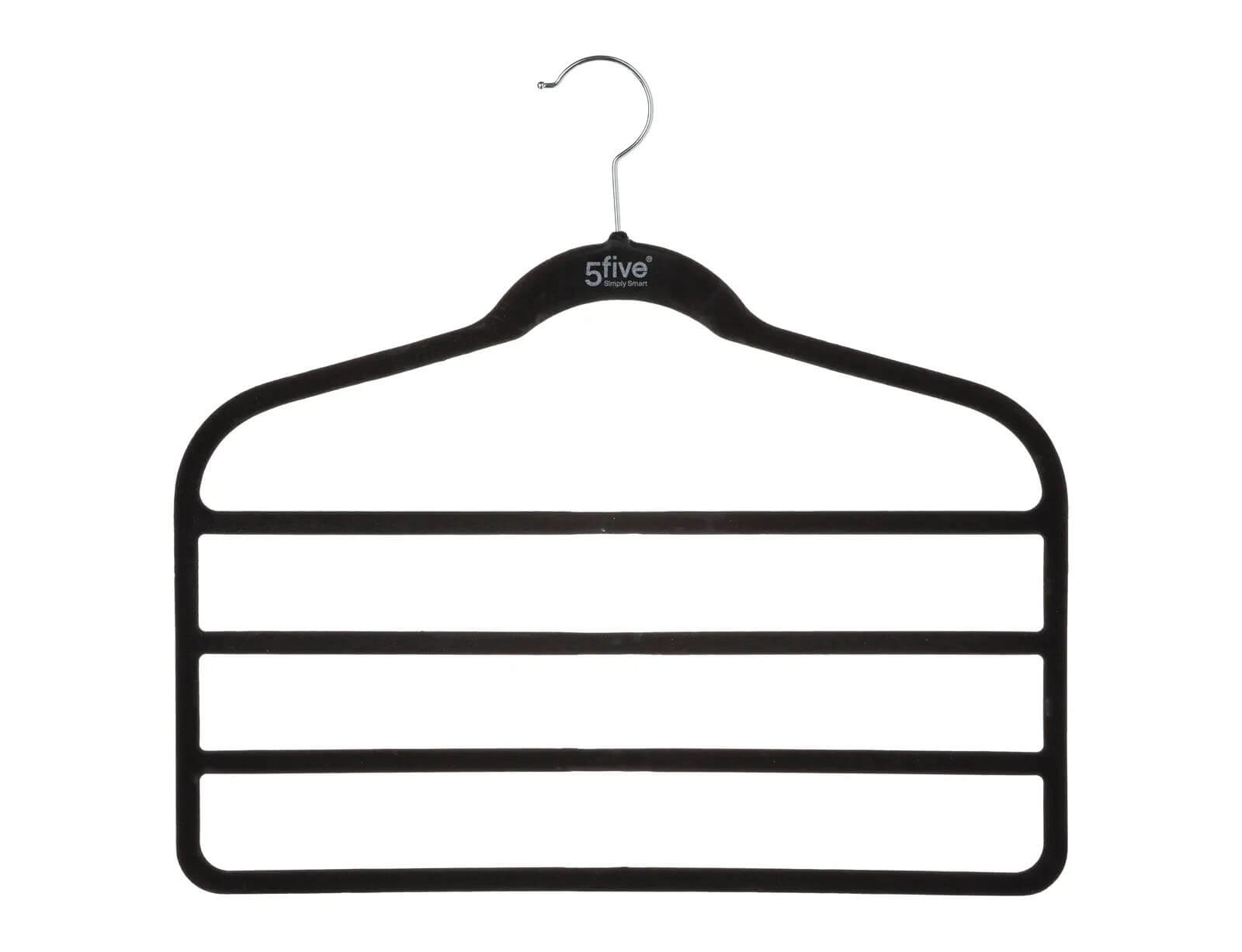 Οργανώστε και ανανεώστε τη ντουλάπα σας με την κρεμάστρα από τη 5five. Χάρη στον μεταλλικό, λεπτό σχεδιασμό μπορείτε να εξοικονομήσετε χώρο στη ντουλάπα σας, ενώ με τη βελούδινη επένδυση που διαθέτει δεν θα γλιστράνε τα ρούχα. Μπορείτε να κρεμάσετε μέχρι και 4 παντελόνια, σορτσάκια κτλ.